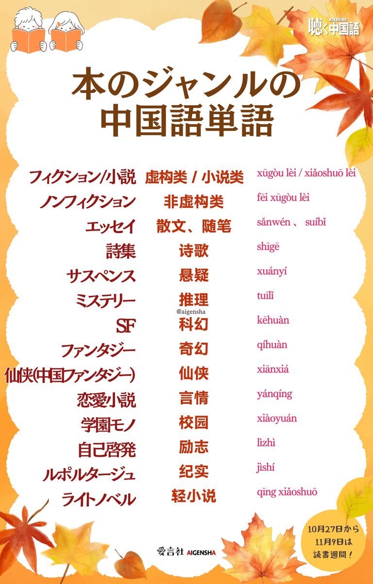【📚本のジャンルに関する中国語単語📙】 10月27日から11月9日までは「読書週間」なんだとか📖✨ ということで、今回は本のジャンルに関する中国語単語を集めてみました✍️ フィクションから恋愛小説、ライトノベルまで、ジャンル名を押さえて秋の読書タイムを充実させましょう! #中国語単語 pic.x.com/P5K4qwNbLy