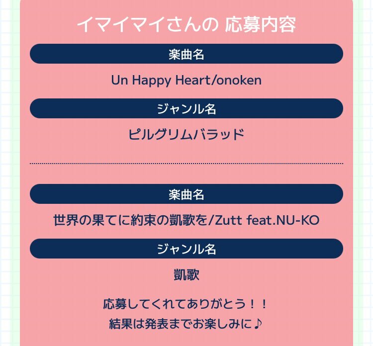 多分最新作に近づくほど競争率は下がると思うんだけど、コレっていうジャンル名が送られて来なかった曲は流石に無理矢理選出するよりスタッフの人が決めるんちゃうかな、と思うから結局センスは必要すぎるんだよな。くるち。
