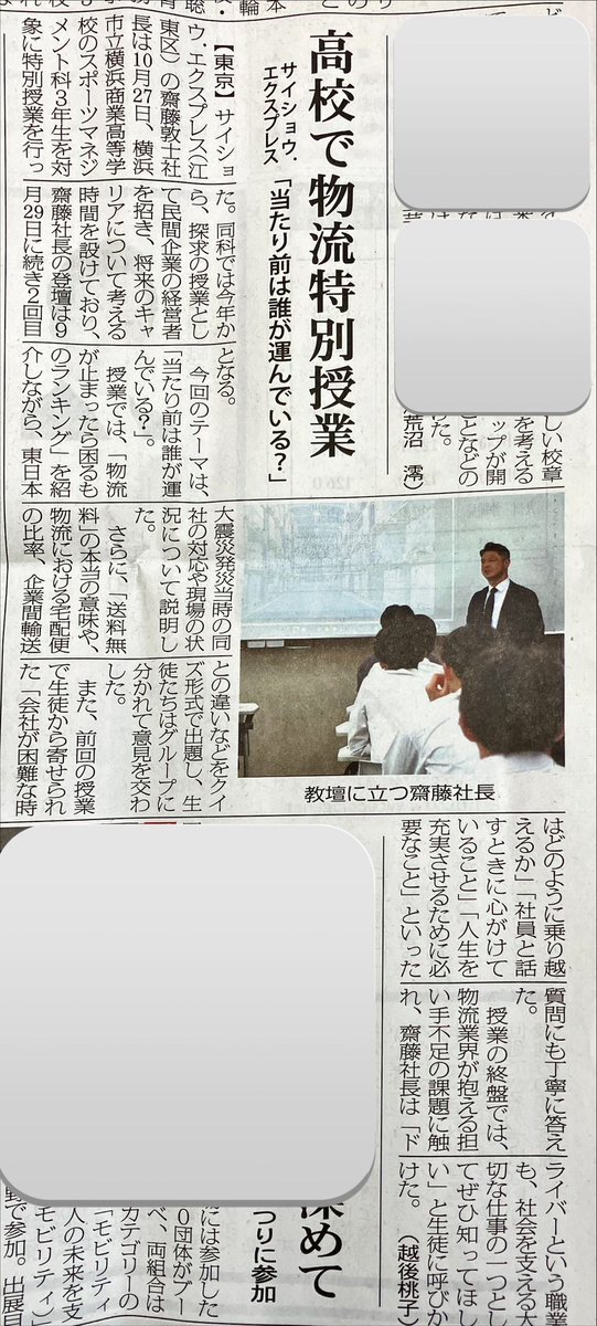 おはようございます☁️ 11月6日発行の物流ウィークリーにて 横浜商業高校スポーツマネジメント科で行った 2回目の特別授業の様子が掲載されました! 是非ご覧ください! 今日も1日ご安全に🚚✨ #企業公式が毎朝地元の天気を言い合う #企業公式が朝の挨拶を言い合う pic.x.com/iM9nUd3iIB