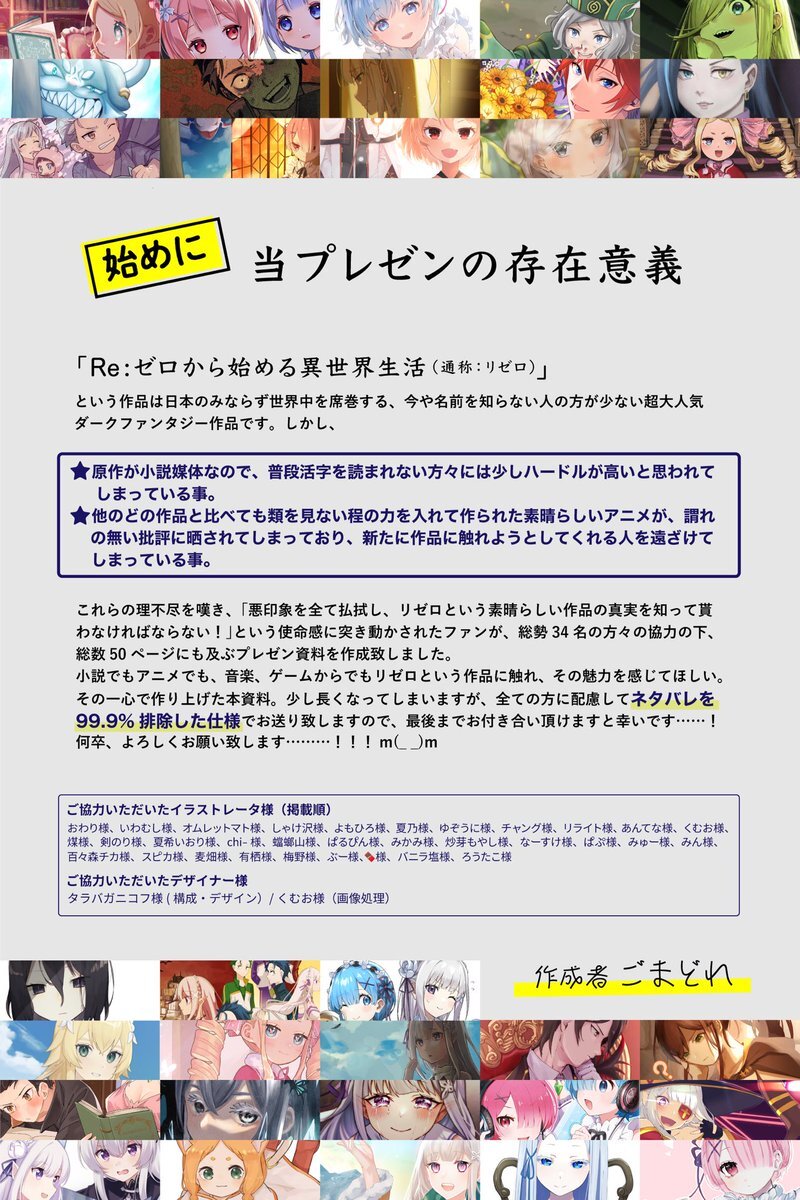 『Re:ゼロから始める異世界生活(通称:リゼロ)』 の「小説家になろう」連載10周年を記念し、全52ページのプレゼン資料を作りました! リプ欄に第1部が続き、 ツリーを変えて第2部、第3部へと続きます! 少し読み辛いですが、 どうか、最後までお付き合い下さい! #Rezero10thAnniversary pic.x.com/aUm7ekfj80