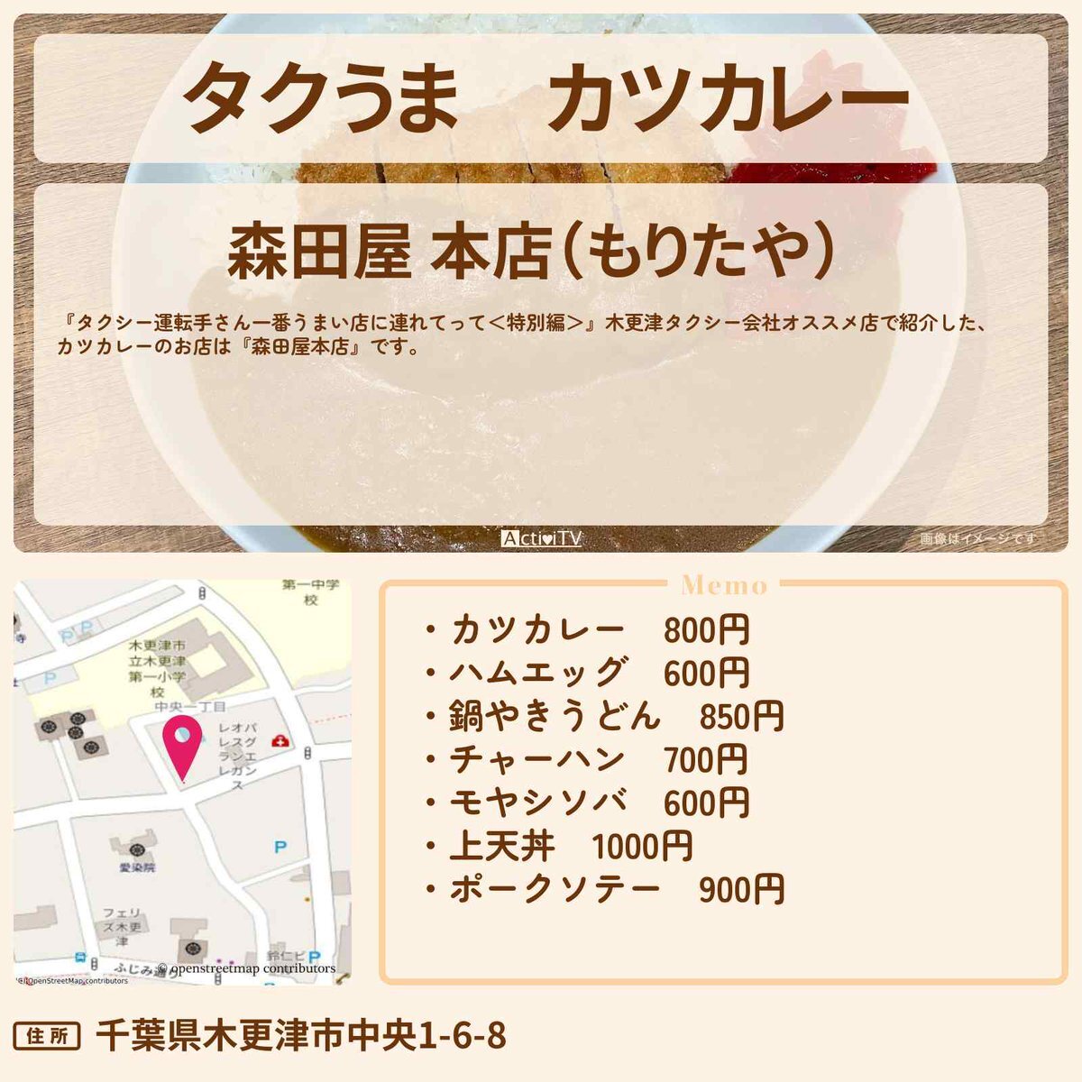 #タクシー運転手さん一番うまい店に連れてって 木更津の蕎麦屋さんのカツカレー 木更津タクシー会社オススメ店 『森田屋本店』のお店情報 【住所】 千葉県木更津市中央1-6-8 詳しくは👉 activitv.com/entry/taxi_uma… #タクうま #吉村崇 #平成ノブシコブシ #鈴木福 #村上佳菜子 pic.x.com/0woKzqw4kq