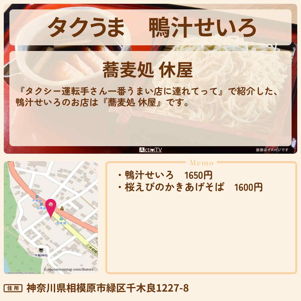 #タクうま 相模原市 鴨汁せいろ で紹介した 『蕎麦処 休屋』の情報を紹介 【住所】 神奈川県相模原市緑区千木良1227-8 詳しくは👉 activitv.com/entry/taxi_uma… #タクうま #タクシー運転手さん一番うまい店に連れてって #吉村崇 #平成ノブシコブシ #塚本高史 #泉里香 #片桐仁 pic.x.com/uezc2f8kDO