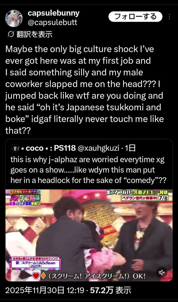 Maybe the only big culture shock I’ve ever got here was at my first job and I said something silly and my male coworker slapped me on the head??? I jumped back like wtf are you doing and he said “oh it’s Japanese tsukkomi and boke” idgaf literally never touch me like that?? x.com/xauhgkuzi/stat…