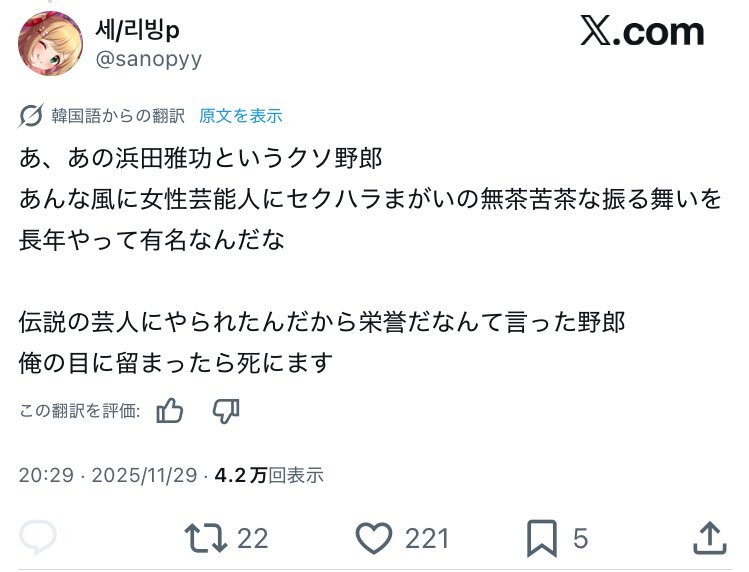 ダウンタウン浜田、韓国人にバチギレられてんな。つかまだこんな芸風が許されてんのがおかしいんだが(´・ω・) pic.x.com/iJ31LRq1WE x.com/sanopyy/status…
