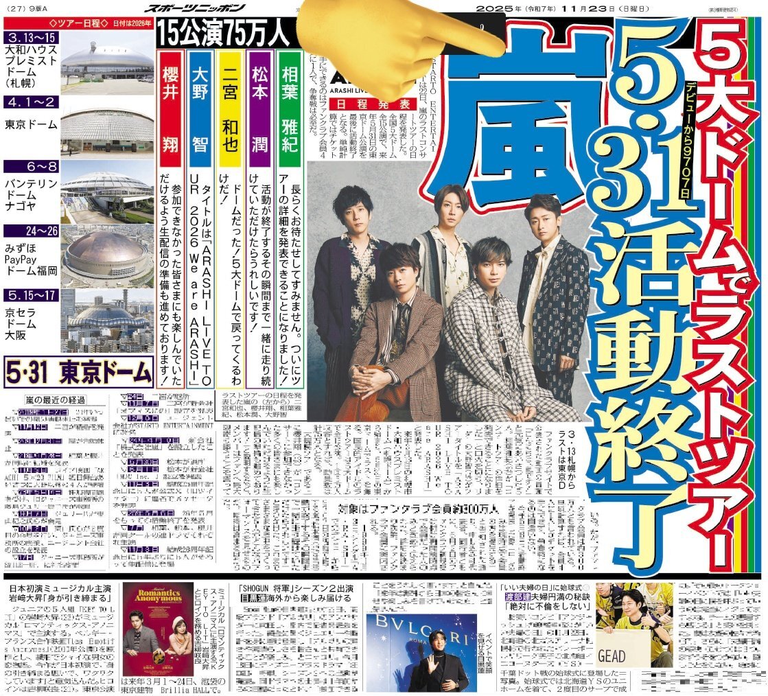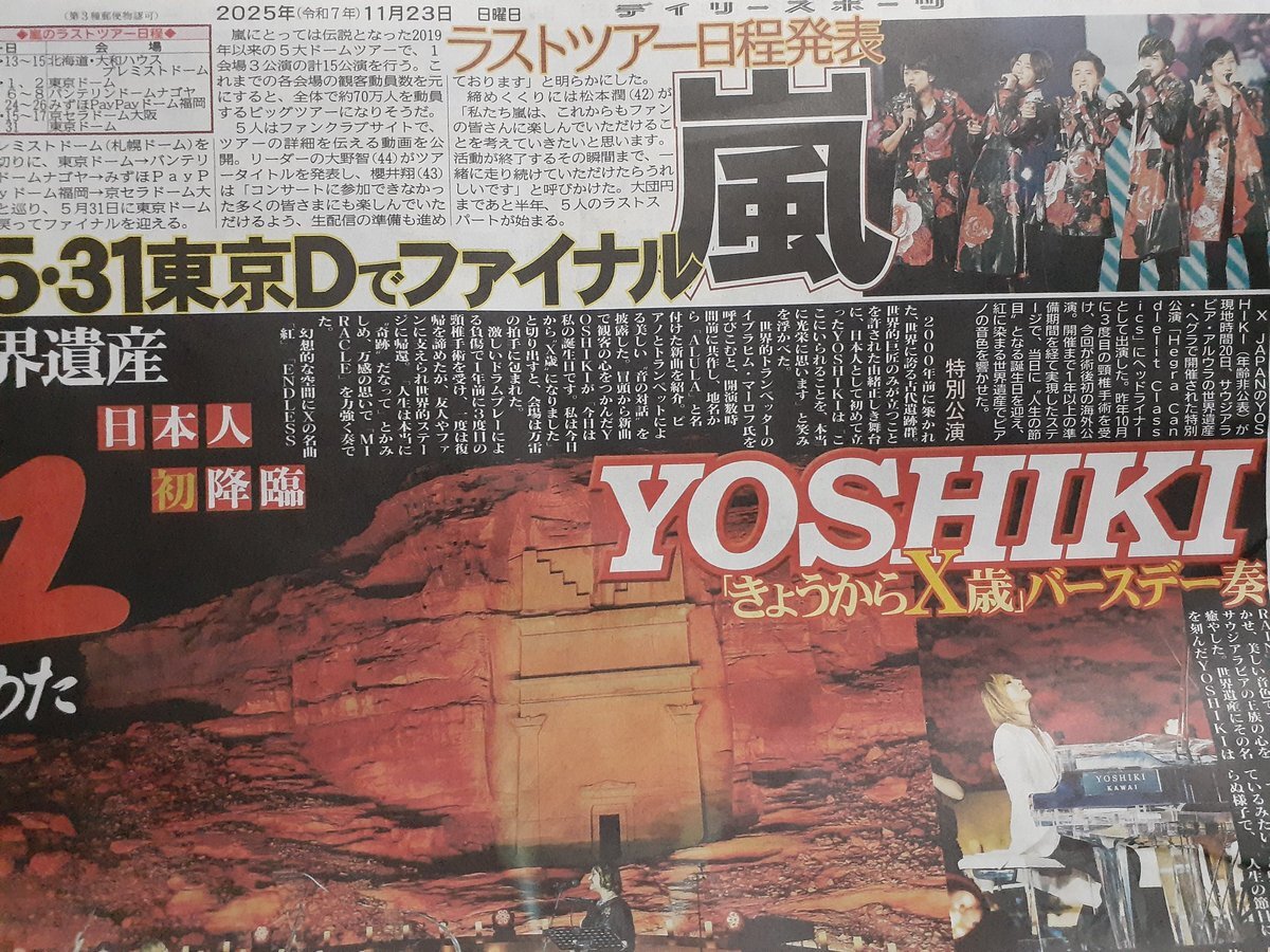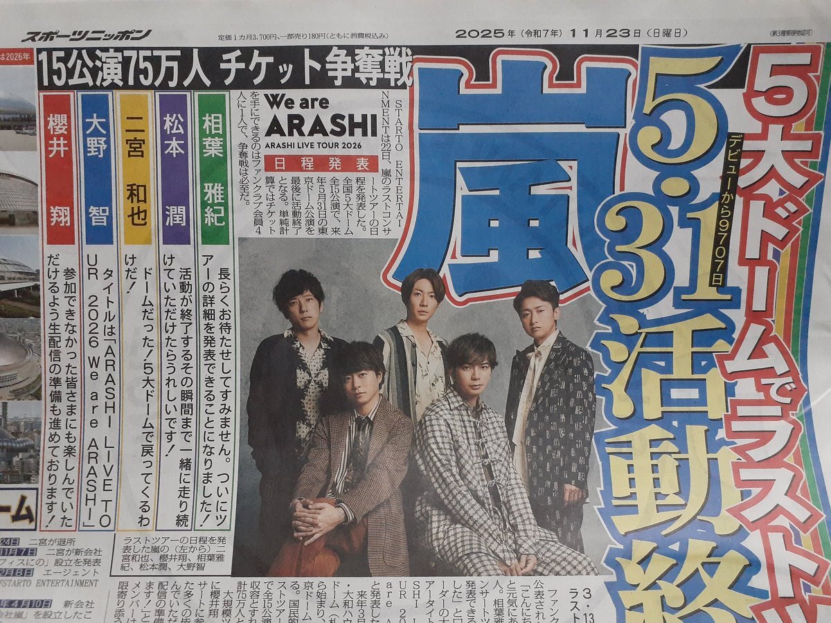 / 23日のスポニチ芸能面は… 嵐 来年5・31活動終了 ラストツアー日程発表! \ ✅岩﨑大昇、日本初 初演ミュージカル主演 ✅目黒蓮、ブルガリアンバサダー就任会見 ✅渡部建、いい夫婦の秘訣は⋯ ぜひお近くのコンビニなどでお求めください📰 pic.x.com/i78Dgjh7uX