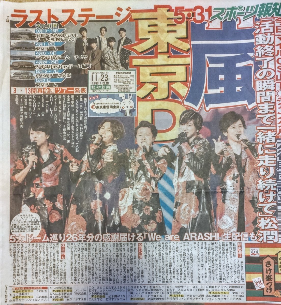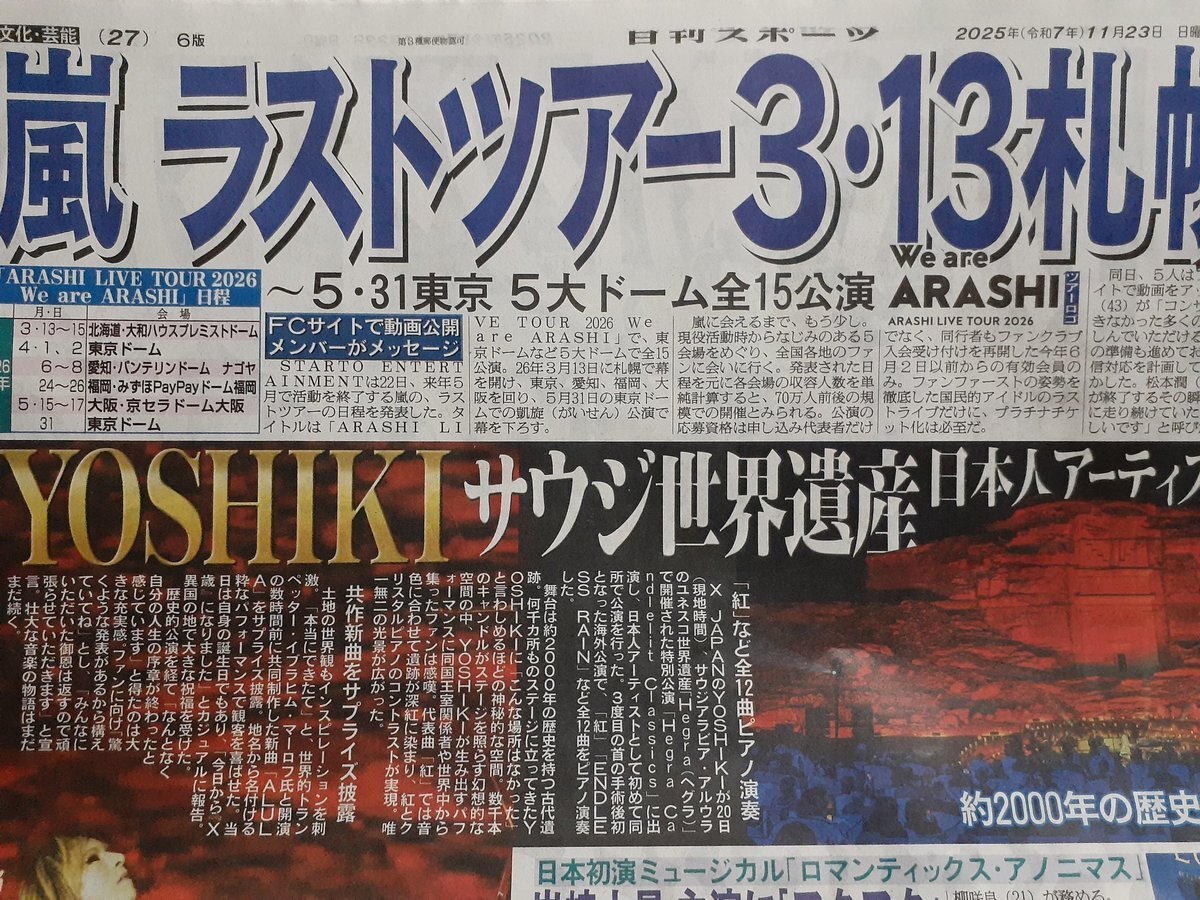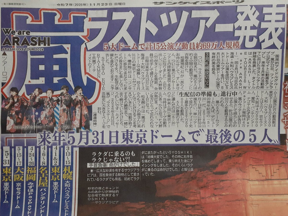 / 23日のスポニチ芸能面は… 嵐 来年5・31活動終了 ラストツアー日程発表! \ ✅岩﨑大昇、日本初 初演ミュージカル主演 ✅目黒蓮、ブルガリアンバサダー就任会見 ✅渡部建、いい夫婦の秘訣は⋯ ぜひお近くのコンビニなどでお求めください📰 pic.x.com/i78Dgjh7uX