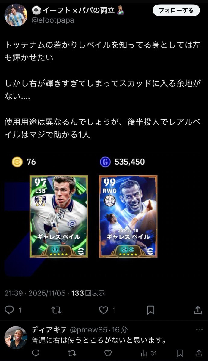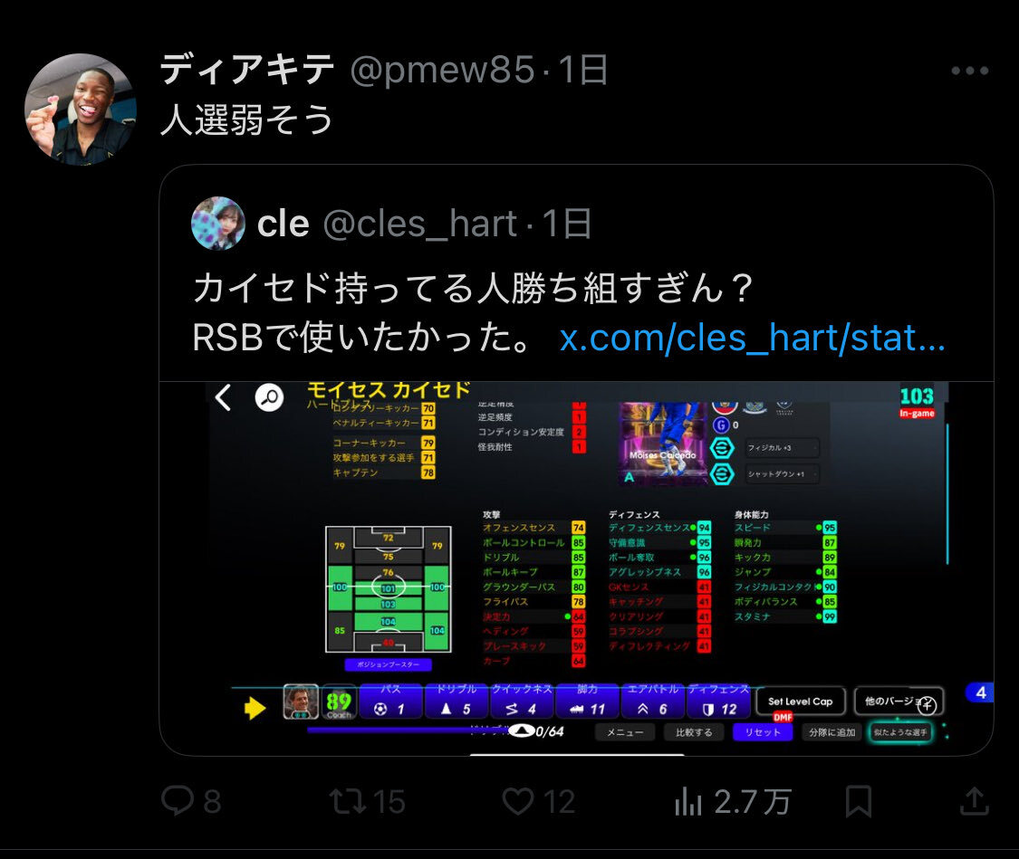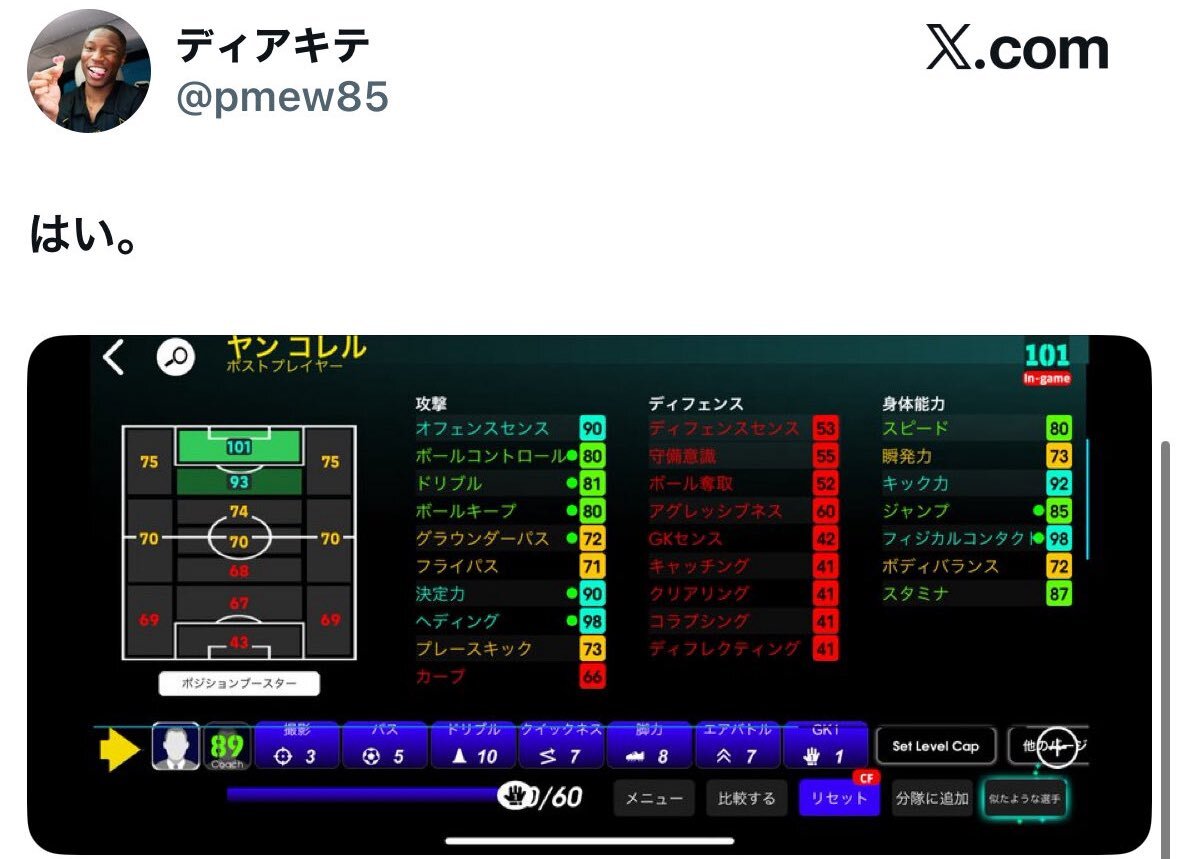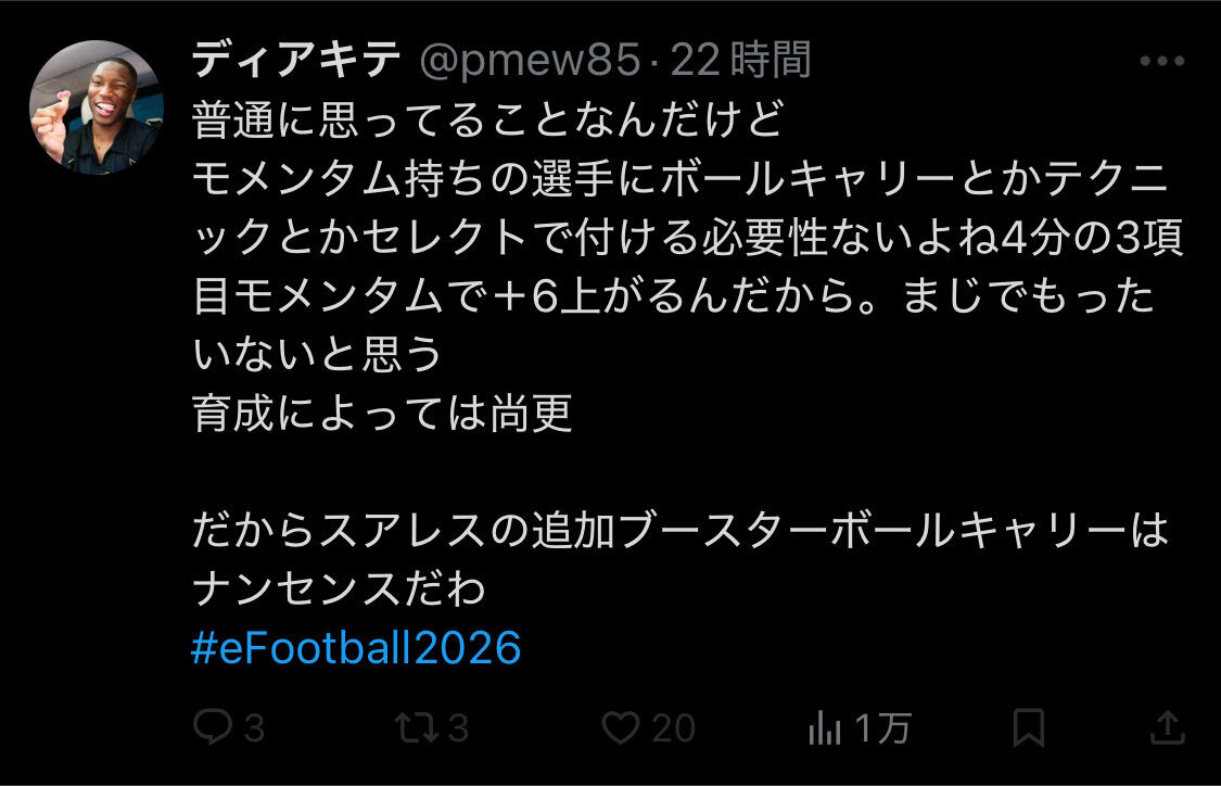 今回のスアレスは他のモメンタム持ちの選手に比べてドリブル3項目もスピードも低いからボールキャリーは良いセレクト。 おまけでボディコンも上がるから問題ない。 そもそも育成によっては尚更とか言ってるけど育成下手でいじられてたやん。 センスないやつを信用するとバカ見るわ。 #ディアキテ pic.x.com/cnLWWEBg6z