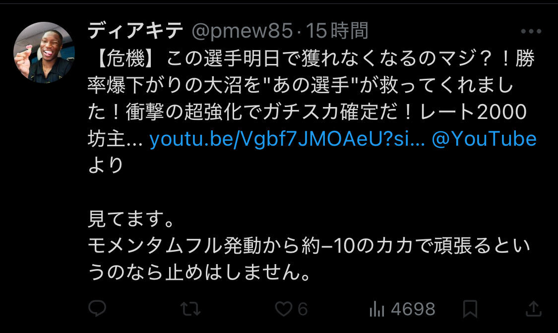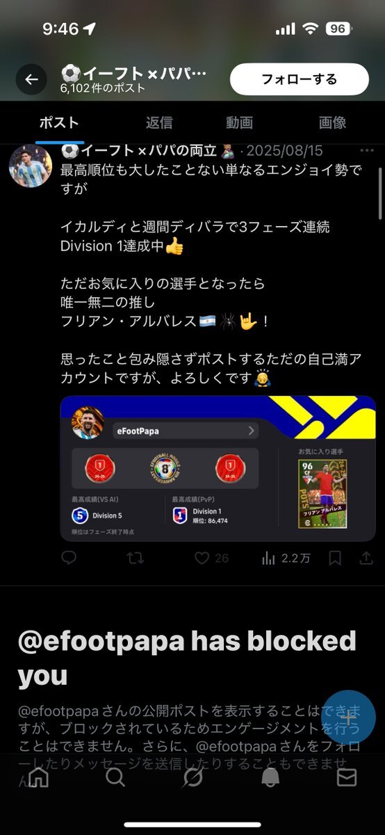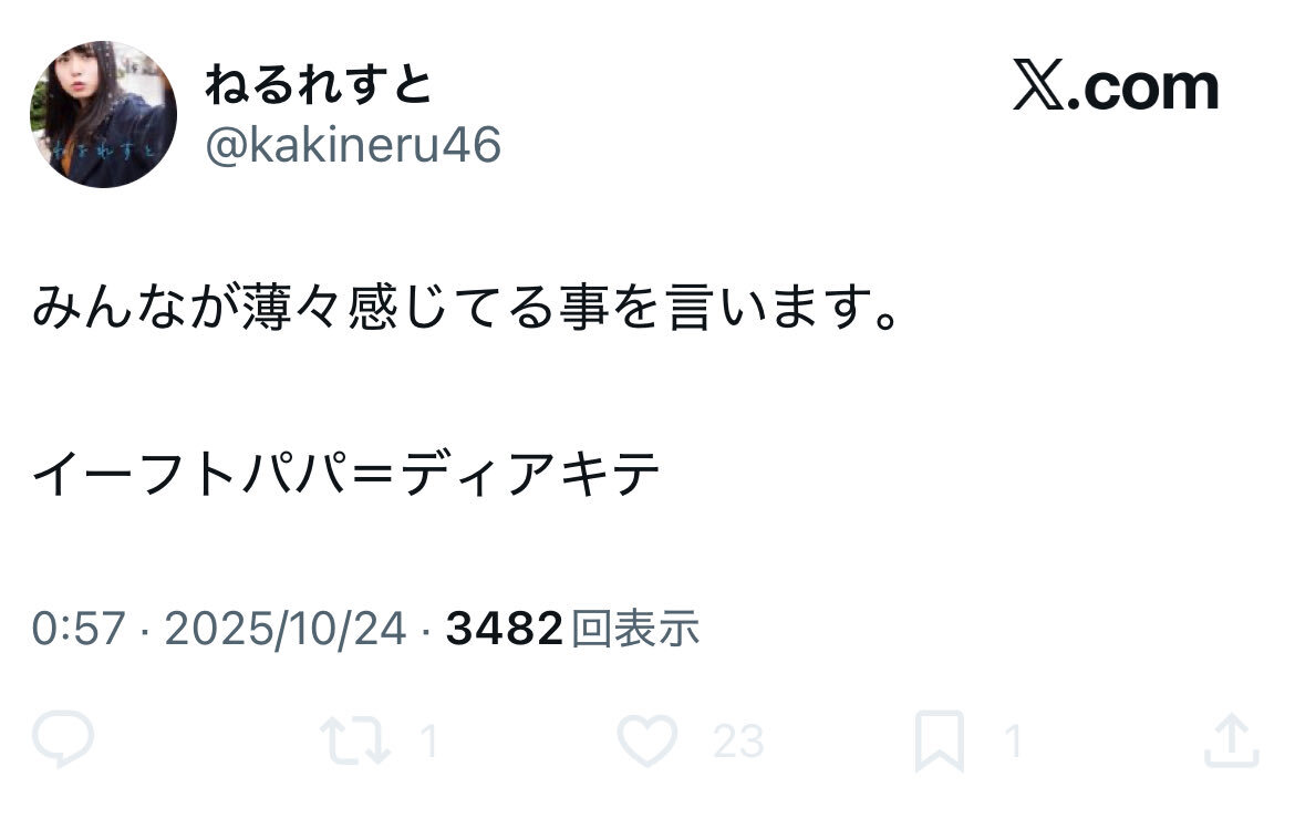 この投稿を見てくれた方へのお願いです。 このリプ欄にディアキテにブロックされて言えなくなったことを書くので、それを当該ポストにリプして頂きたいです。 もう返す語彙力も低下して瀕死の状態なので、トドメさしたって下さい🙇♀️ #イーフト #ディアキテ pic.x.com/TkYaQxS62R
