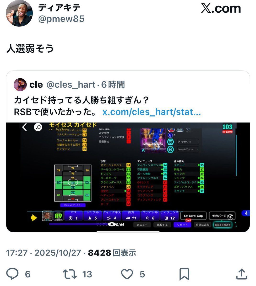 言い返せなくさせてから強気なの雑魚ムーブすぎてしぬ 他人のリプ欄で「その育成だと〜🤓🐮」とか言ってるくせに何言ってんねん お前しかヤンコレルドリブル10振り、デンベレがCFランキング11位とかしてねえんだから、お前が逆 客観視してねえからそんなキチガイが出来上がる #イーフト #ディアキテ pic.x.com/ZXQmjXwG7C