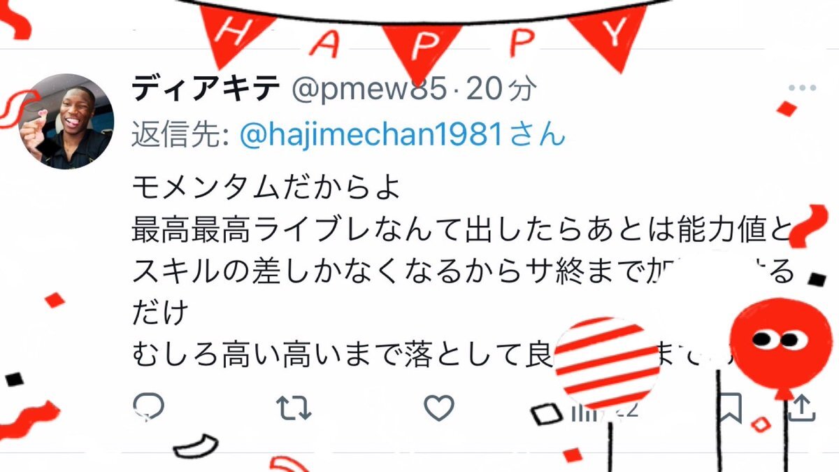 返信先:@hajimechan1981モメンタムだからよ 最高最高ライブレなんて出したらあとは能力値とスキルの差しかなくなるからサ終まで加速させるだけ むしろ高い高いまで落として良かったまである