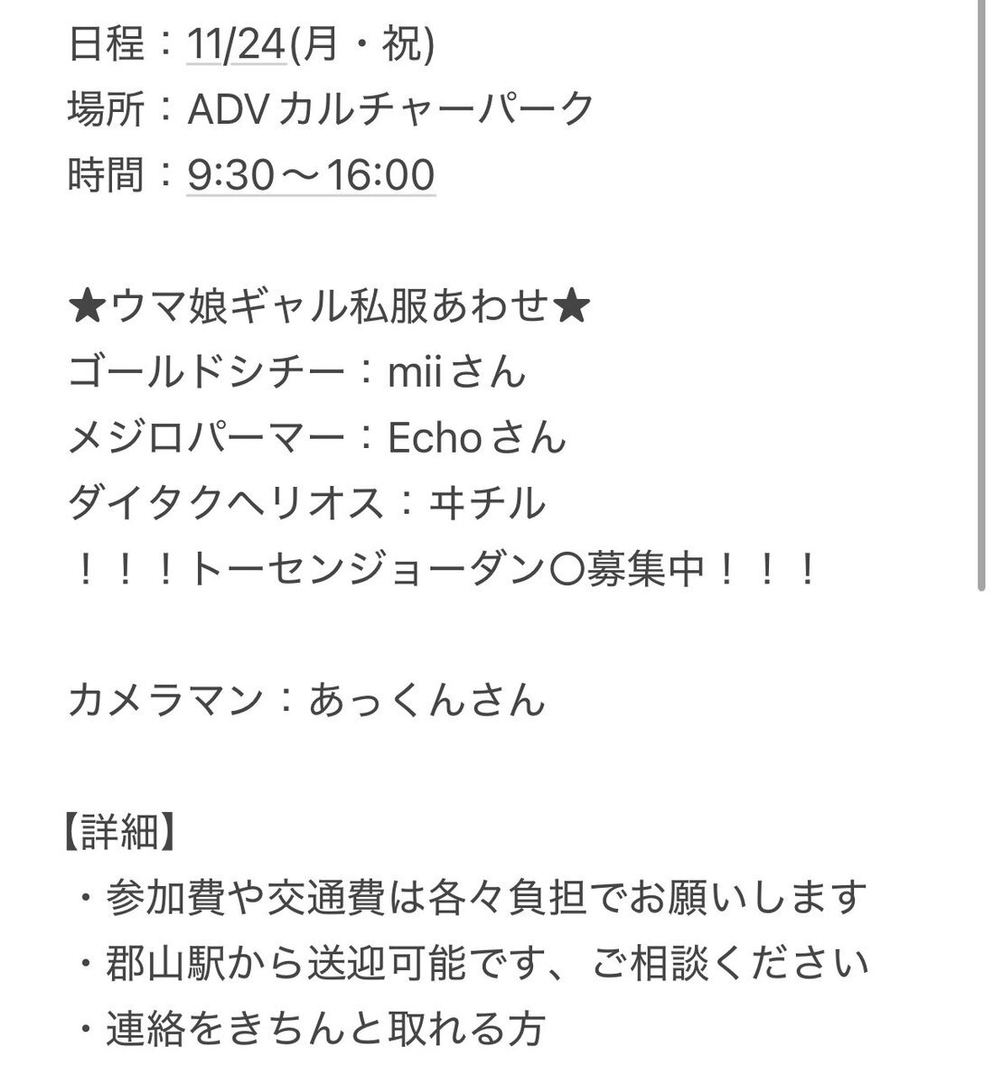 11/24(月祝)のカルチャーパークでウマ娘ギャル私服合わせをやるにあたり、トーセンジョーダンを募集しています。他娘3人とカメラマンさんは揃っております。お問い合わせはお気軽にどうぞ!切実ですので宜しくお願い致します🙇♀️