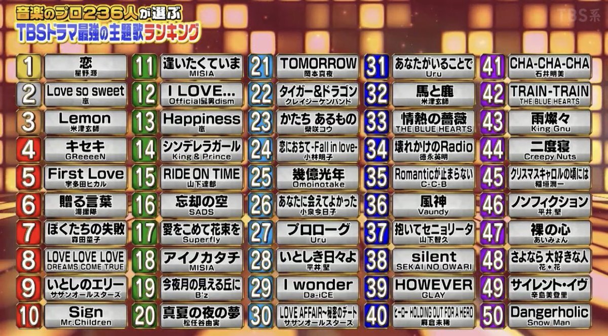 zmedia.jp/entertainment/… 音楽のプロ236人が選ぶTBSドラマ最強の主題歌ランキング – TVer … Official髭男dism「I LOVE…」☆宇多田ヒカル「First Love」☆柴咲コウ「かたち あ … #Official髭男dism