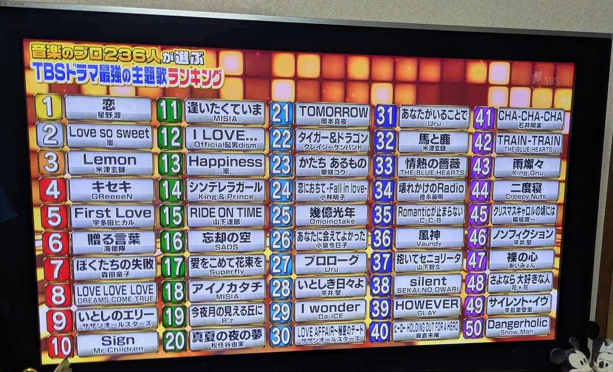 切ない気持ちのまま帰宅したらTVでやってた、TBSドラマ最強の主題歌ランキングが神番組だった アンナチュラル、テセウス、義母と娘のブルース、ノーサイドゲーム、花男、花晴れ、その他諸々は強すぎる、、 個人的にはマイファミリーのUruのそれを愛と呼ぶならも大好きだから入ってて欲しかったけど😂