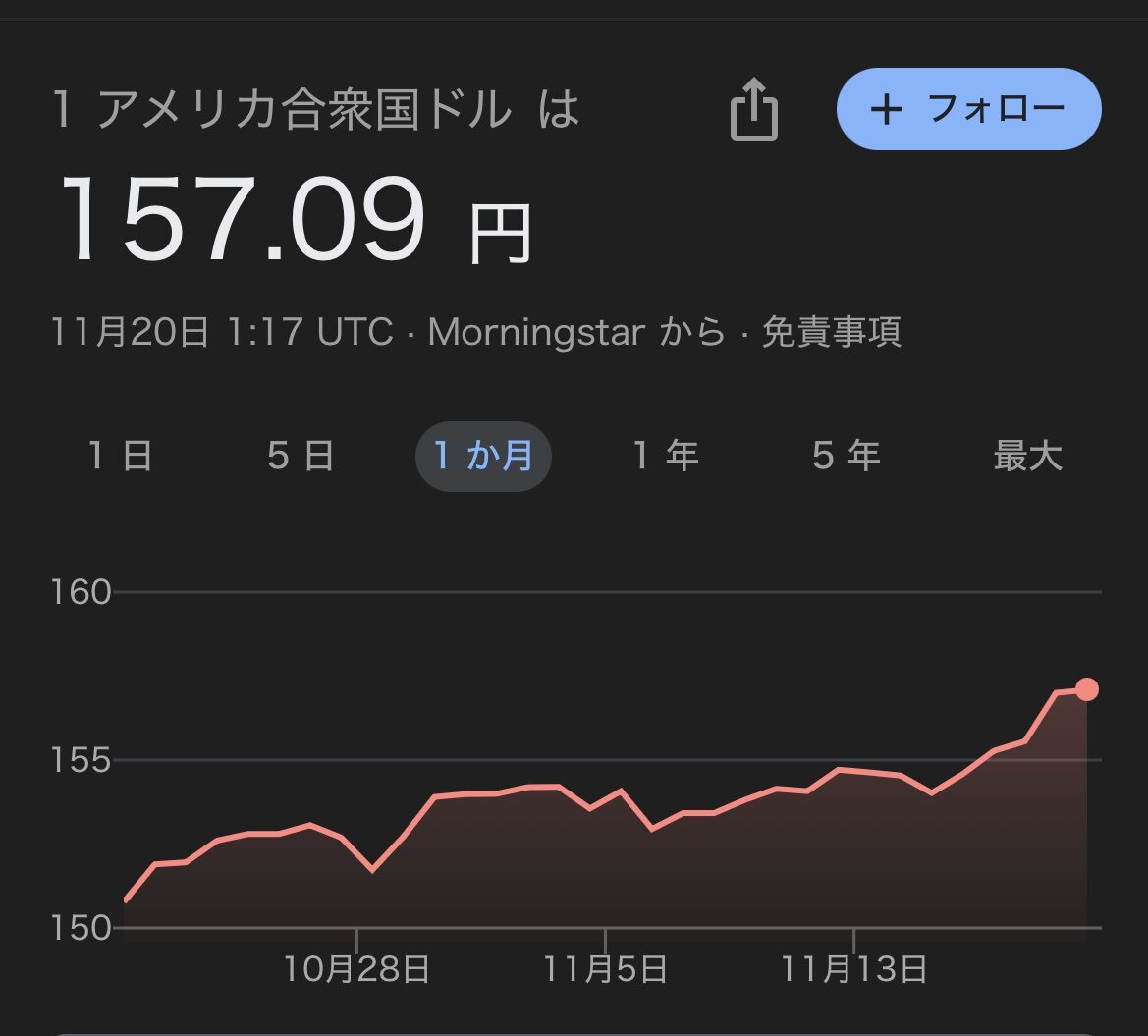 げ、ドル円157円になってる...。 昨日154円とかじゃなかった? 1日で3円も安くなっちゃったの?