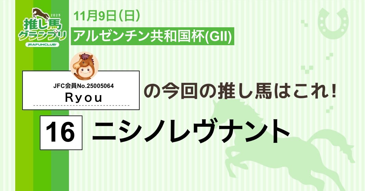今週の #推し馬グランプリ 対象レースは #アルゼンチン共和国杯 私の予想は #ニシノレヴナント ! 予想を的中させて、抽選で素敵な賞品がもらえるキャンペーンに応募しよう! #JRAFUNCLUB #JRAFUN ↓推し馬グランプリはコチラ↓ club.jra-fun.jp/oshiuma/ pic.x.com/zH9UCjkpid