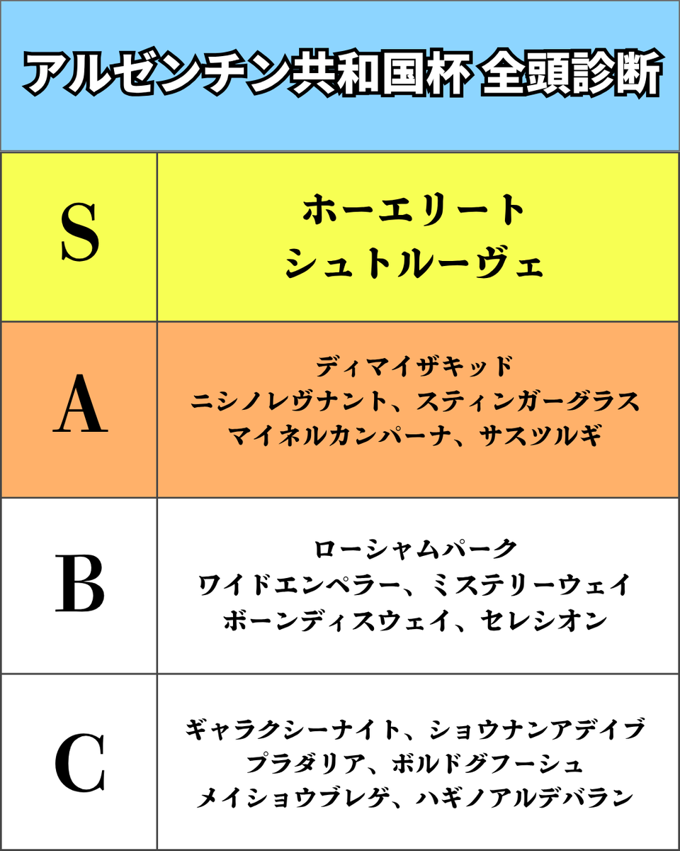 【アルゼンチン共和国杯 全頭診断】 アルゼンチン共和国杯の全頭診断です!参考になったら、いいねとフォローをしてくださると嬉しいです✨ S評価 ホーエリート シュトルーヴェ A評価 ディマイザキッド ニシノレヴナント スティンガーグラス マイネルカンパーナ サスツルギ B評価 ローシャムパーク pic.x.com/VK2WaILEjI