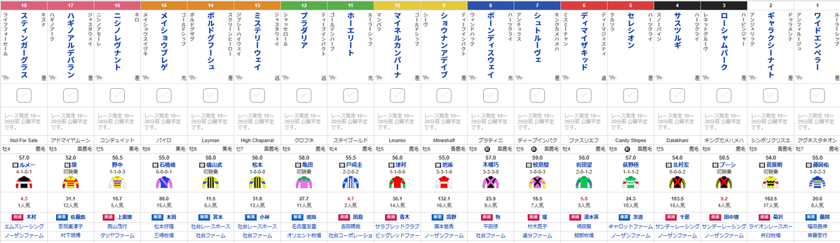 6-12 プラダリア 牡6 58.0 亀田 7-13 ミステリーウェイ 騸7 56.0 松本 7-14 ボルドグフーシュ 牡6 58.0 横山武 7-15 メイショウブレゲ 牡6 55.0 石橋 8-16 ニシノレヴナント 騸5 56.5 野中 8-17 ハギノアルデバラン 牡5 52.0 原 8-18 スティンガーグラス 牡4 57.0 ルメール