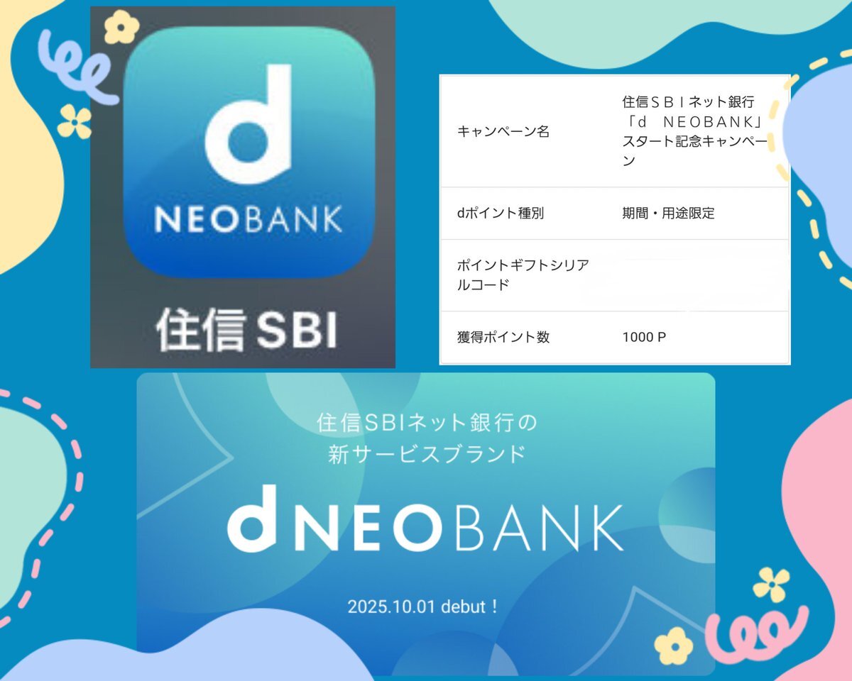 住信SBIネット銀行【公式】 (@sumishinsbi)様 「d NEOBANK」スタート記念「住信SBIネット銀行公式X」フォロー&リポストキャンペーンにて当選して…🆕 dポイント1,000ポイントを戴きました📩 ㊗️「d NEOBANK」スタートおめでとうございます👍️ ありがとうございました🥳 #当選報告 pic.x.com/ALsuXP3dYg