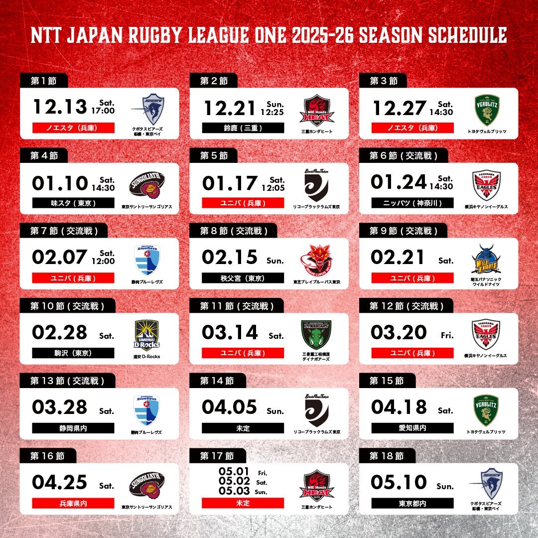 NTTジャパンラグビー リーグワン2025-26 D1 第14節 試合日程追加決定のお知らせ🗓️ league-one.jp/news/4900 (更新🆙) 第14節➡︎4月5日(日) \みんなで行こう!リーグワン!!/ 【リーグワン&ホストゲーム開幕戦】 12月13日(土) 🆚S東京ベイ🦄 🏟️ノエビアスタジアム神戸 ⏰17:00KO #リーグワン pic.x.com/u7yVarjSt3