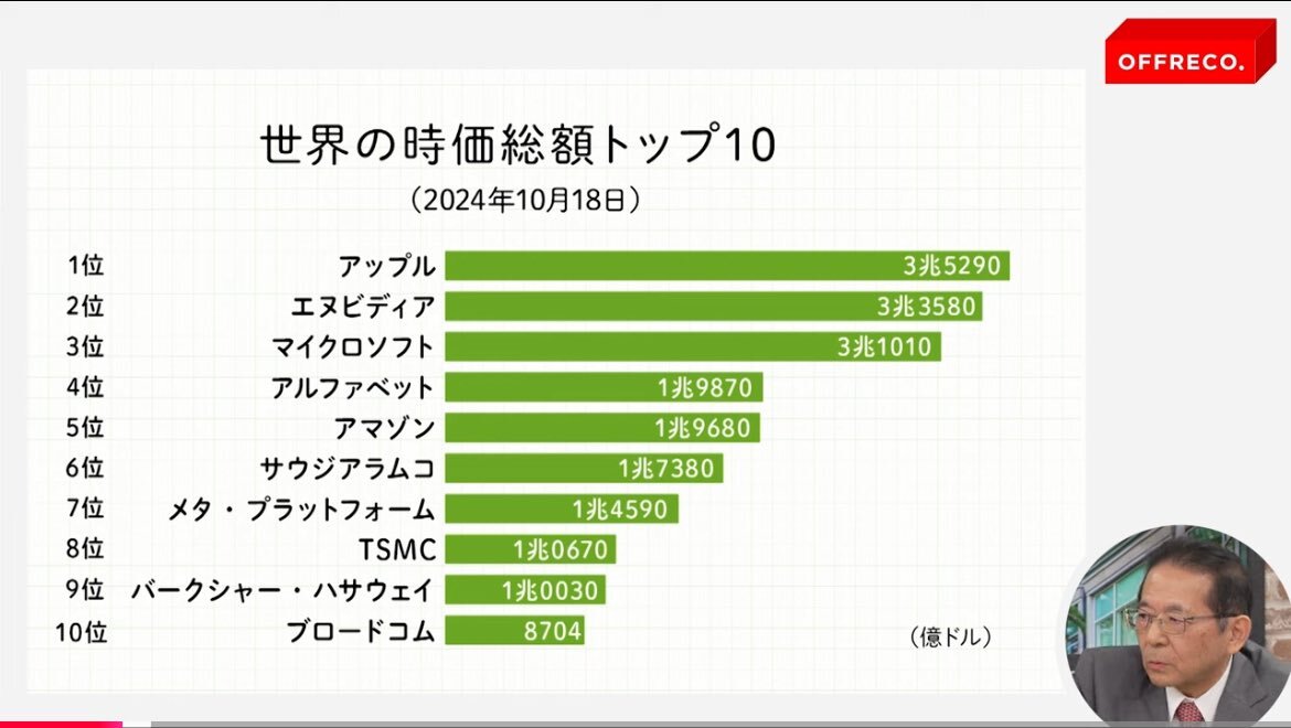 世界の時価総額トップ10 (2024.10.18時点) 1 アップル 2 エヌビディア 3 マイクロソフト 4 アルファベット 5 アマゾン 6 サウジアラムコ 7 メタ・プラットフォーム 8 TSMC 9 バークシャー・ハサウェイ 10 ブロードコム Dream big. 夢は大きく Start small. 小さく始める Take risks. リスクを取って
