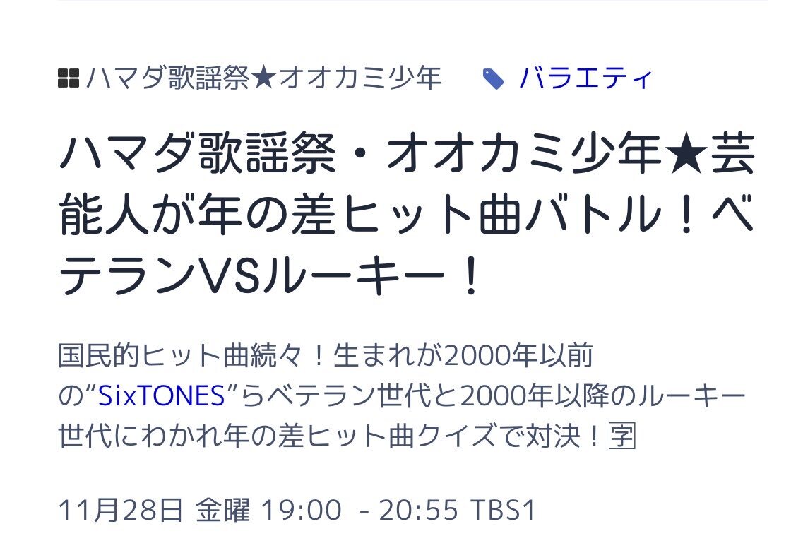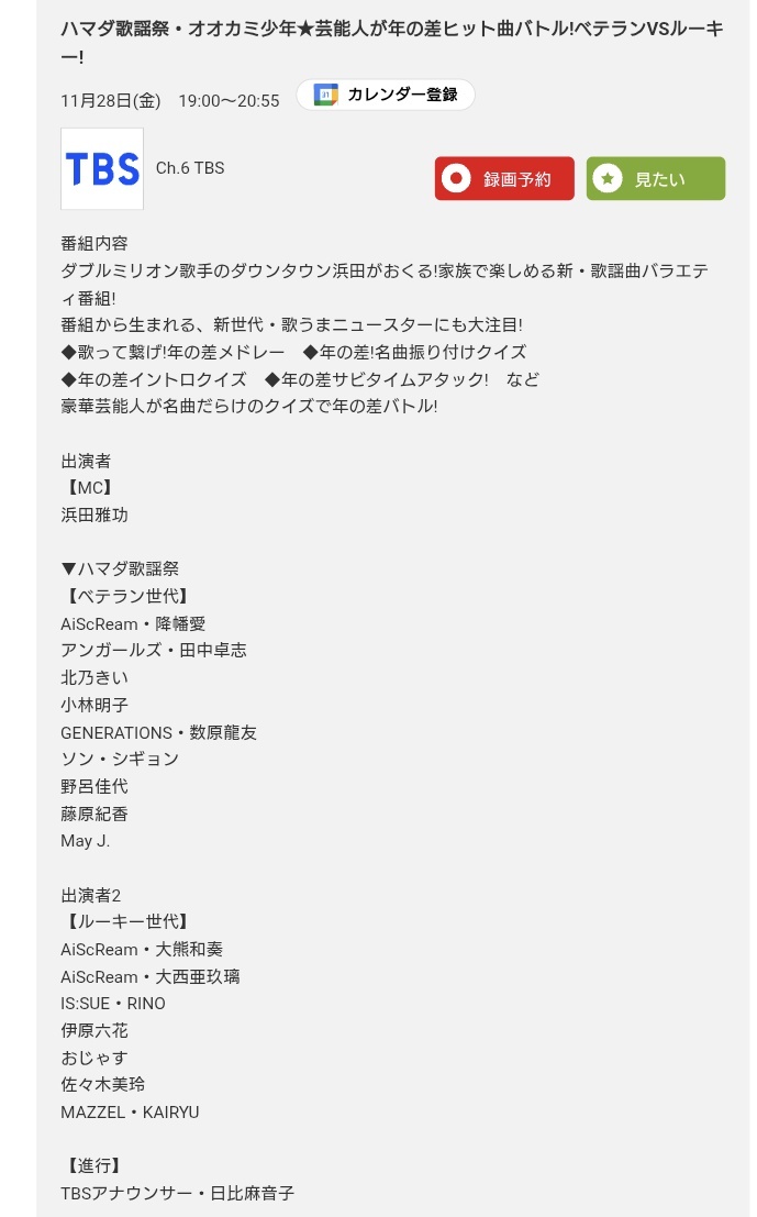 ハマダ歌謡祭#69どこでも視聴可TVerリアタイ配信tver.jp/live/simul/leq… TBS11/28(金)19時 #ハマダ歌謡祭 #浜田雅功 ジェシー 田中樹 KAIRYU(#MAZZEL)大熊和奏・大西亜玖璃・降幡愛(#AiScReam)RINO(#ISSUE)佐々木美玲 伊原六花 数原龍友(#GENERATIONS)ソン・シギョン 北乃きいtvguide.myjcom.jp/program/864582…