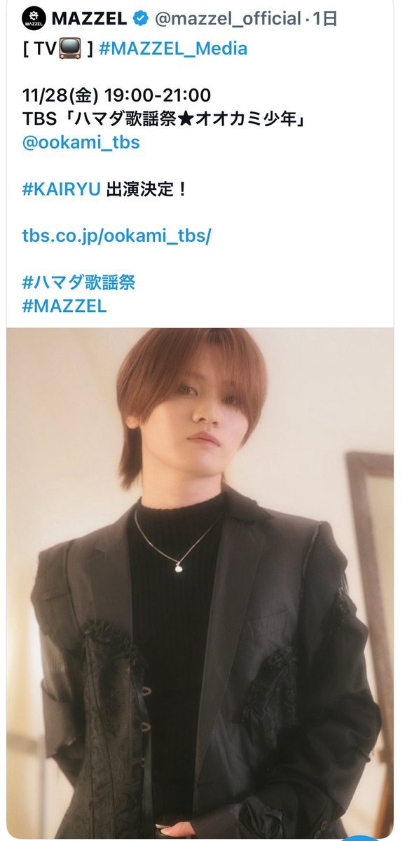 [ TV📺 ] #MAZZEL_Media 11/28(金) 19:00-21:00 TBS「ハマダ歌謡祭★オオカミ少年」 @ookami_tbs #KAIRYU 出演決定! tbs.co.jp/ookami_tbs/ #ハマダ歌謡祭 #MAZZEL
