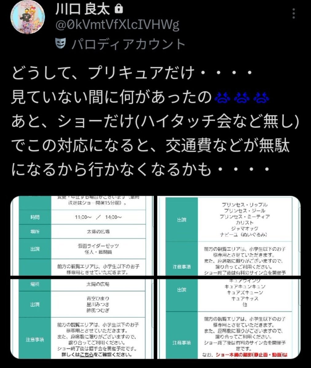 【ちょっと愚痴💦 ごめんなさい】 いっその事…キミプリライブ中に例の人(サ〇ミGX。今は、似非の川〇良太)の問題行動を見かけたら、ハートガーデンで…空間を切り離してライブ会場から追い出してあげたい… 過去において、例の人に嫌な思いをされて…プリキュア垢を消してtwitterを辞めた方がいたから pic.x.com/gjTxc6Hby4 x.com/angelkokonacha…