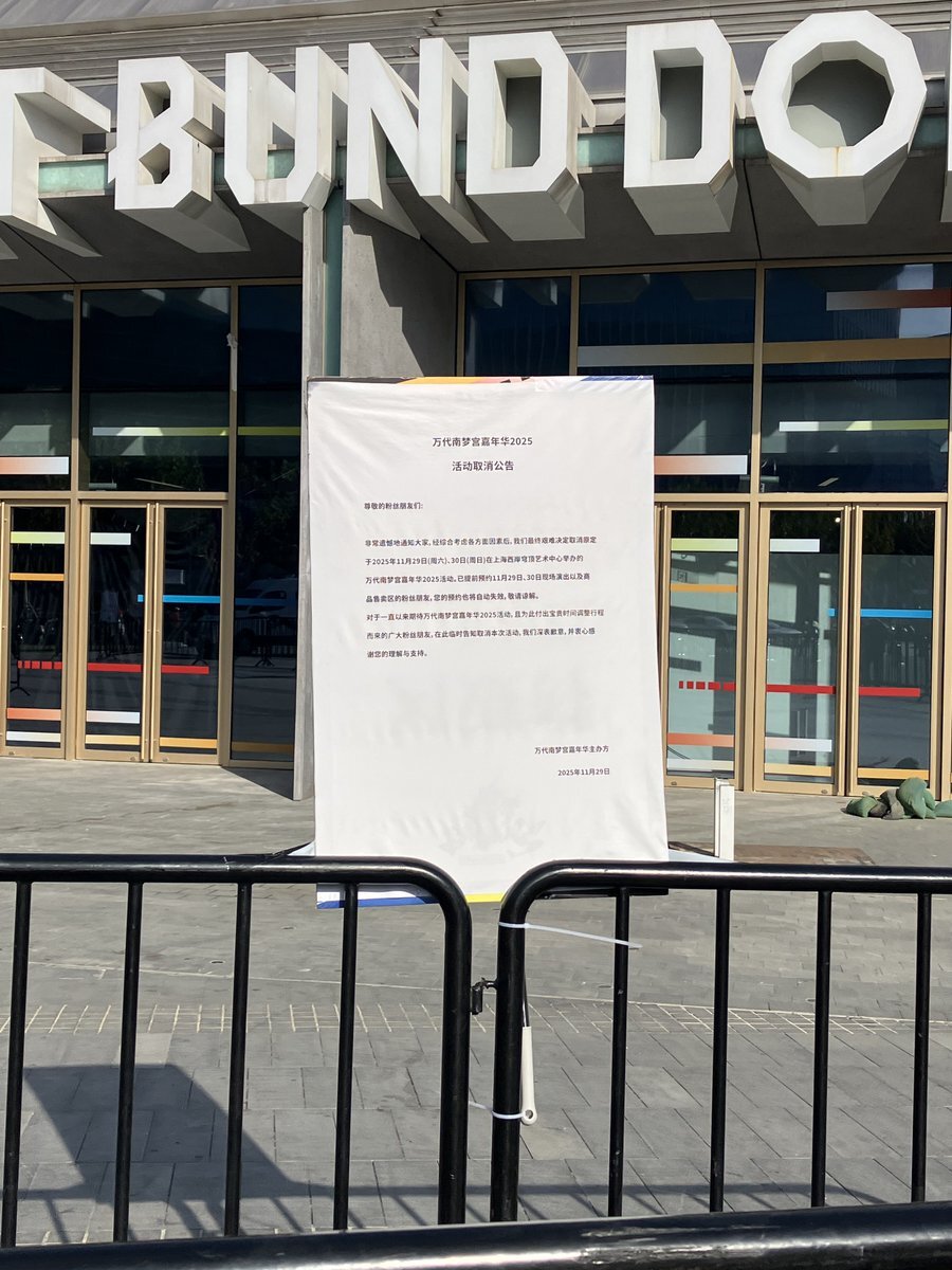 元々中国での海外公演は省級の文化観光局による管轄だから中止・継続は各省バラバラだったけど最後まで踏ん張った上海は今日ついに陥落。夜18時バンナムフェス上海で歌唱中の日本アーティストさん途中退場を境にこれからの日系公演は一掃。 面白いのは地元アイドルの日本曲カバーも禁止になるらしい。 pic.x.com/WHX2kw1uh7 x.com/kaf_info/statu…