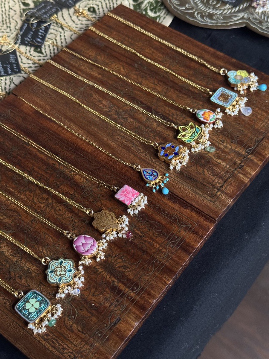 インドの伝統工芸ミーナカリに極小の淡水パールや天然石を組み合わせたネックレス ミーナカリはシルバー98%素材のベースにクダイと呼ばれる彫りを入れ、ガラス質と18金で模様を施したものです 全てキオカさん @h18kyoko_cioca がインドで直接製作を依頼しているもの 他では手に入りません ¥19800〜 pic.x.com/xFcOD0Ey4s