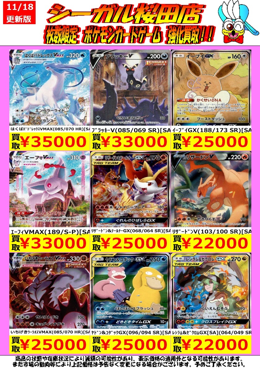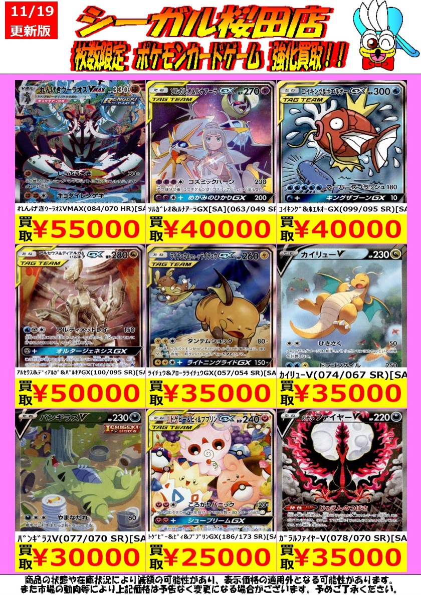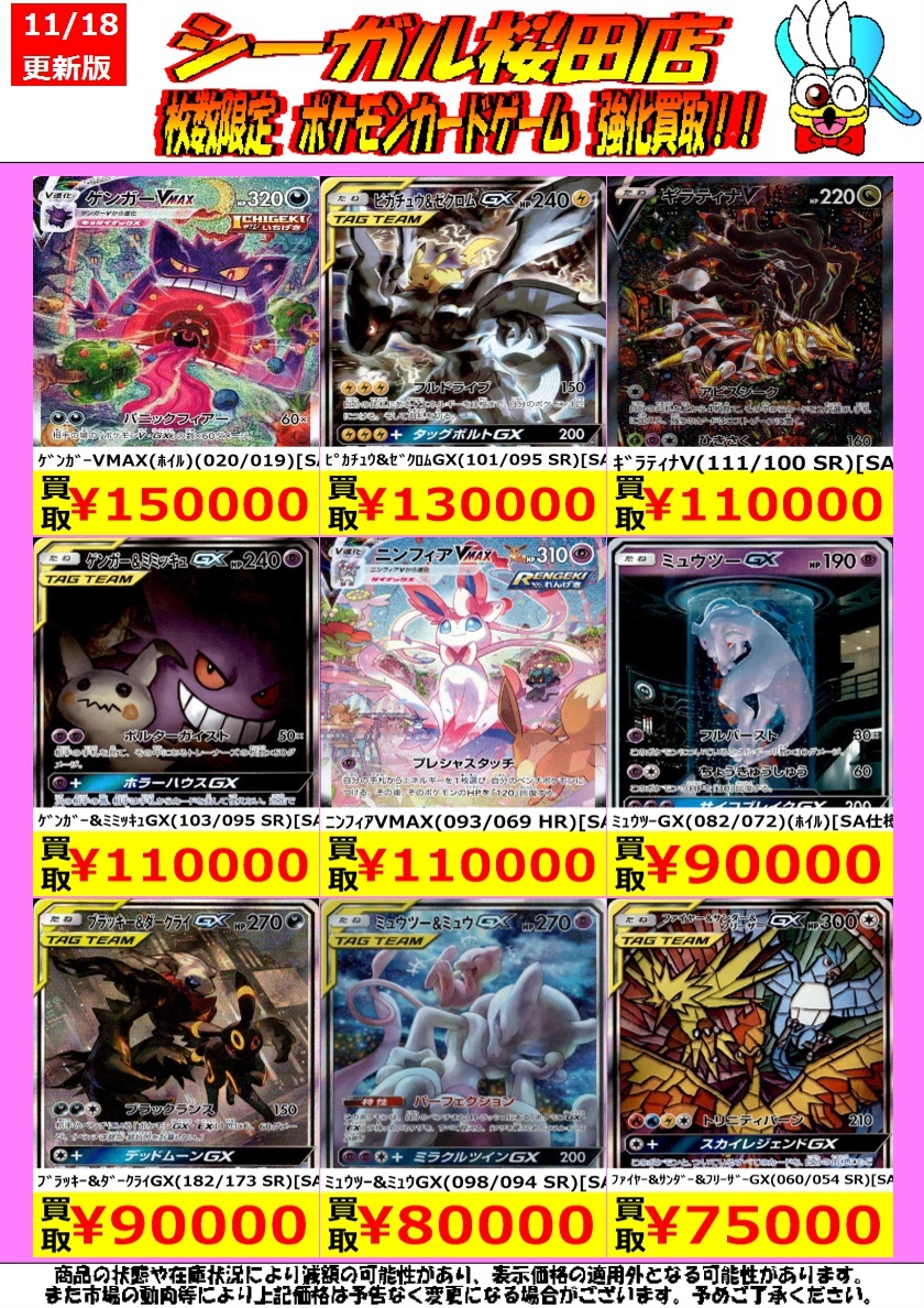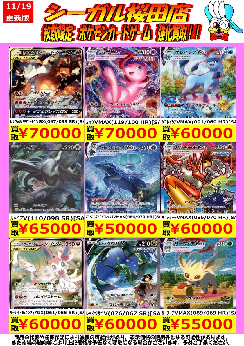 11/19(水)ポケカ強化買取表②📣 🟣ローリエ本舗 AKIHABARA店🟣 『TAG TEAM(タッグチーム)・サポート』買取表 🆙 ラティアス&ラティオスGX SR [105/095] 🆙 ピカチュウ&ゼクロムGX SR [101/095] 🆙 ファイヤーサンダー&フリーザGX(三鳥)SR [060/054] 🆙 サーナイト&ニンフィアGX SR [061/055] pic.x.com/PeWSBIyRZH
