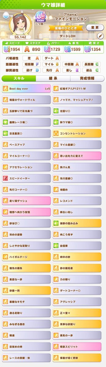 ようやくマイルSダートAな殿下が作れた。固有も2つ継承して、金スキルも完走してスキルは50個積めた。◎にもできて、そのあたりは文句ないんだが、道中の練習がほんと光らなくてスタミナが… そのせいでUB9止まり泣 でもこっちの方がさっきの子よりきっと強いと思う。 #ウマ娘 #ファインモーション pic.x.com/Yz2bBVmtRI