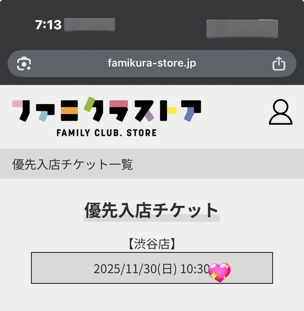@1 ファミクラストア 渋谷入店整理券 チケットお譲り先を探しています。 【譲】 12/3(木) 15:15/17:15/18:15 【枚数】 1枚 【金額】0.05(PayPay) 🌟お時間過ぎていても入店可 お返事早い方優先 お心当たりのある方はdmまでお願いします。 #ジャニショ譲 #ファミクラ譲 #ファミクラストア譲