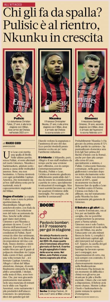 📰 Today’s @Gazzetta_it… 🤝 "Who's going to play second fiddle to Leao? Pulisic is returning, Nkunku is improving."