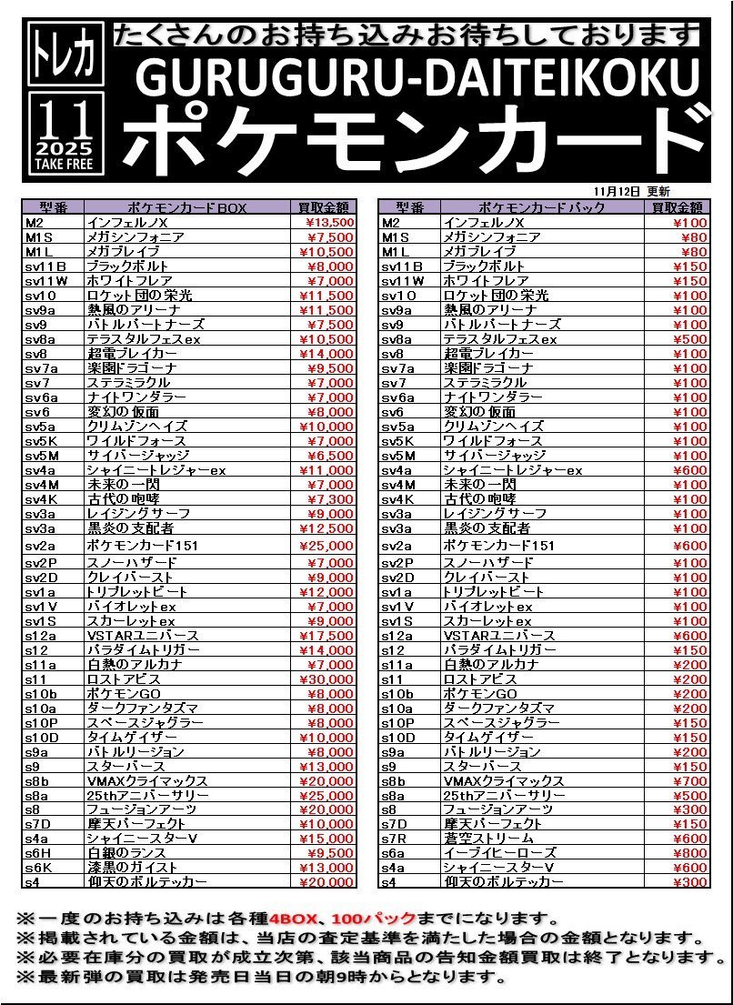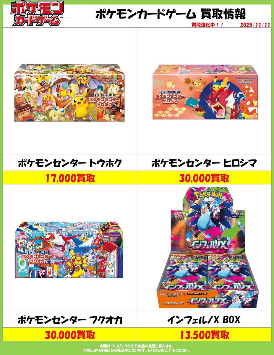 【ポケモンカード買取情報】 ポケカの買取リストを更新いたしました🔥 ポケモンセンタートウホク、ポケモンセンターヒロシマ、ポケモンセンターフクオカに関しては限定買取となりますので、おひとり様1個までの限定価格となります。(予告なく終了の可能性があります) #ポケカ #ぐるぐる大帝国 #大和 pic.x.com/xouCCKAOOG