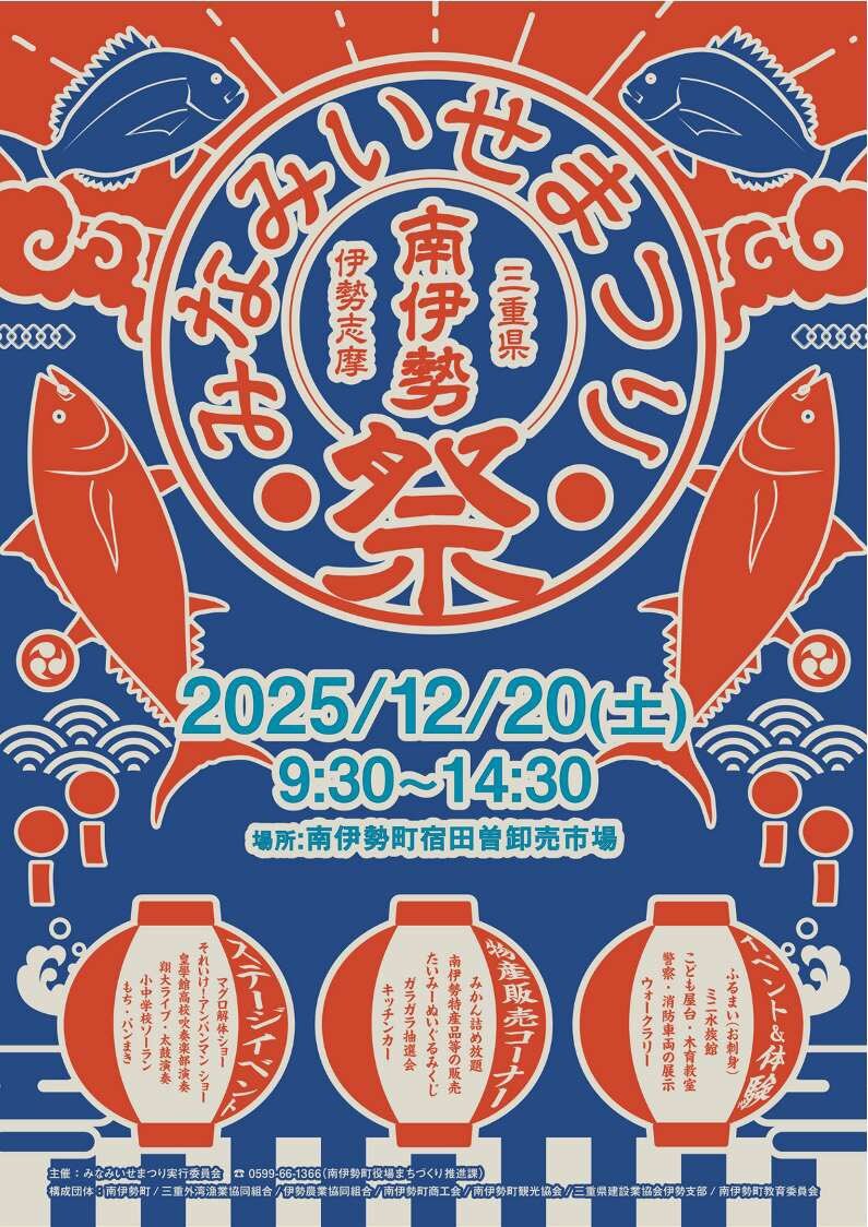 みなみいせまつり開催のお知らせ🐟⛴️🌊 ・日時:12月20日(土)9:30~14:30 ・場所:南伊勢町宿田曽卸売市場 物産販売コーナーやマグロの解体ショー、刺身ふるまいや、海産物ガラガラ抽選会のほか、なぶら太鼓、小中学生のソーラン、翔大ライブなど✨ 最後はみんな大好き餅・パンまきもあります! pic.x.com/OE4FExoCX4