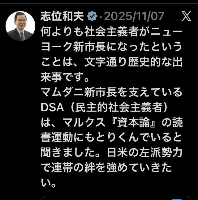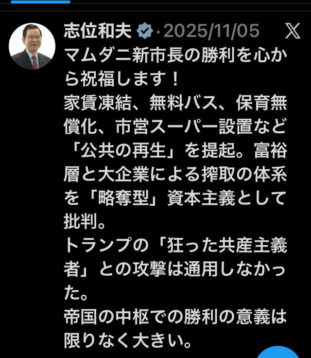 返信先:@Witchwatch99ニューヨークの新市長にマムダニ氏が選ばれたのも、市民のレベル低下ですかね。 薔薇色の選挙公約の殆どが権限が無く実現しないことが確定しているのに当選してしまった。