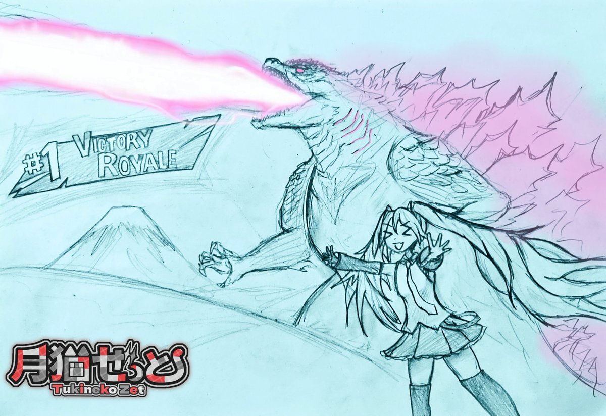 『ミクゴジビーム!』 フォトナで自分の好きなゴジラと初音ミクがコラボしてて最高でした(*ΦωΦ) そして実はゴジラと初音ミクが同作品でコラボしたのこれで4回目なんだよね(ガチ) #Fortnite #フォートナイト #ゴジラ #初音ミク #アナログイラスト #デジタルイラスト
