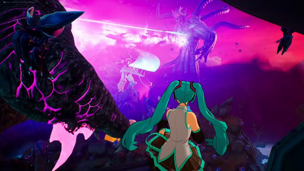 Godzilla and Hatsune Miku doing the Miku Miku beam in the Fortnite live event