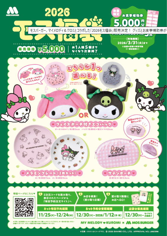 ネット予約11月25日から マイメロディ&クロミ×モスバーガー 2026モス福袋 | モスバーガー公式サイト - mos.jp/oc/fukubukuro2…