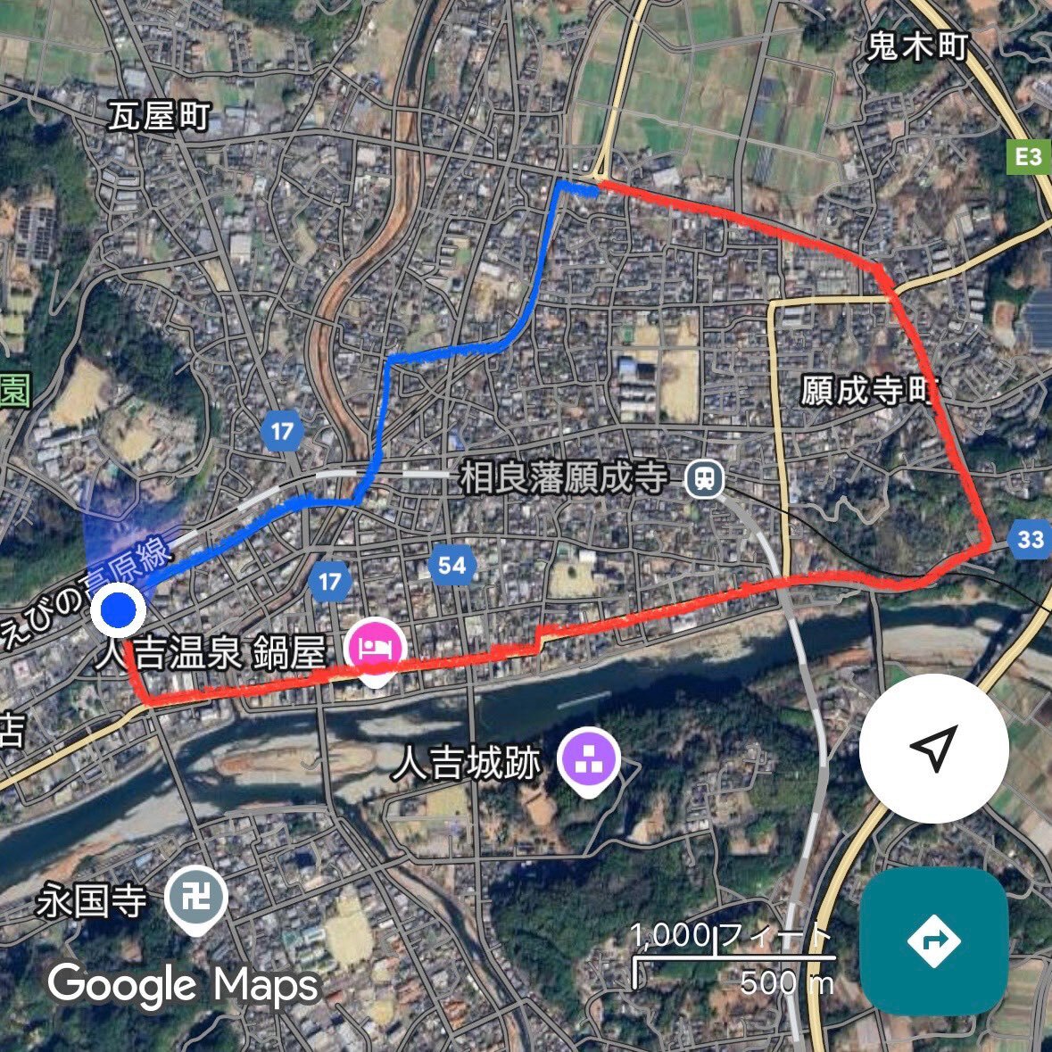 バス待ち中に昨日の答え合わせ。 青が最短ルート(1.3km)で赤が歩いたルート(5.0km)。 初っ端から間違えてて我ながら面白すぎますねえ、おかげで球磨川沿いを歩いたり人吉城跡を眺めたり出来たのでヨシ! pic.x.com/NSlIhCJ06T