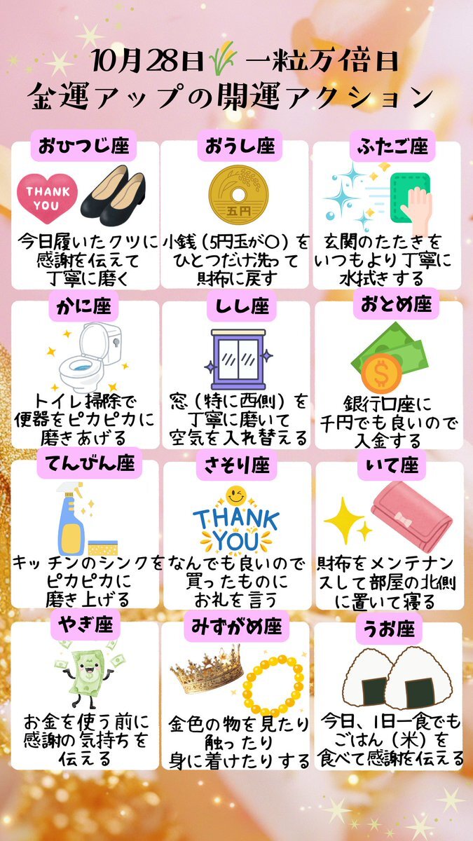 10月28日🌾一粒万倍日 金運アップの開運アクション💰⤴ 午後からでもできる、簡単な開運アクションをまとめました。 いいね❤で金運覚醒✨ リプライ「🌾(←稲)」で豊かさの波が押し寄せてきます。 物心共に満たされる1日でありますように٭(ㅅ˘˘)♡*.+゜🌟 pic.x.com/fMt66h4PLv