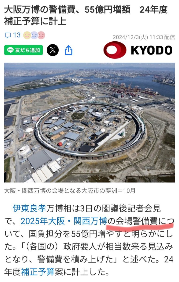返信先:@Dg1xeztWqeQorud2ほう "会場警備費"は"万博の警備員さんの費用"とは違うのか 何が? 『当初は主に入場料収入でまかなう「運営費」に含んでいたが、予算を圧迫していたことから政府が前面に立つ方針に転換していた。』 ていう2023年の記事も貼る? 何が"当たり前"? pic.x.com/zAV23QyELx