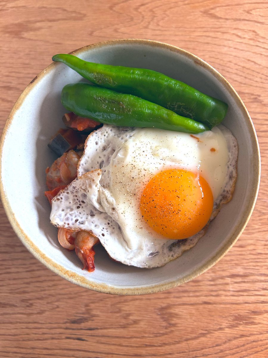冷凍ごはんと作り置きの海老茄子トマト煮を丼に入れて万願寺とうがらしと卵を焼いてのっけました  まいうー♪ #家飯 #昼ごはん #作り置き pic.x.com/LGZG3dYtXJ
