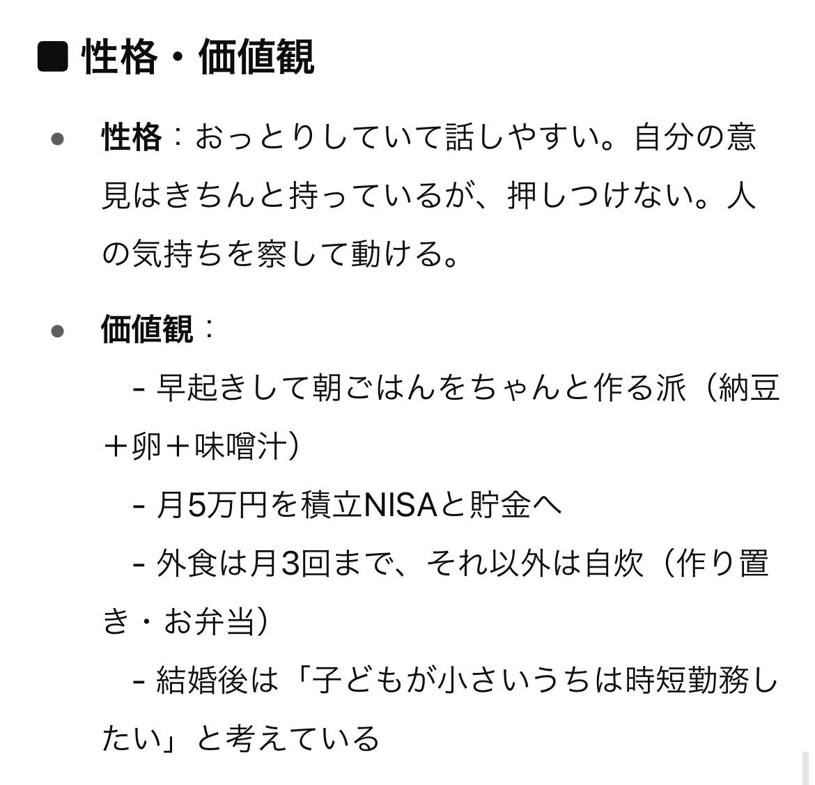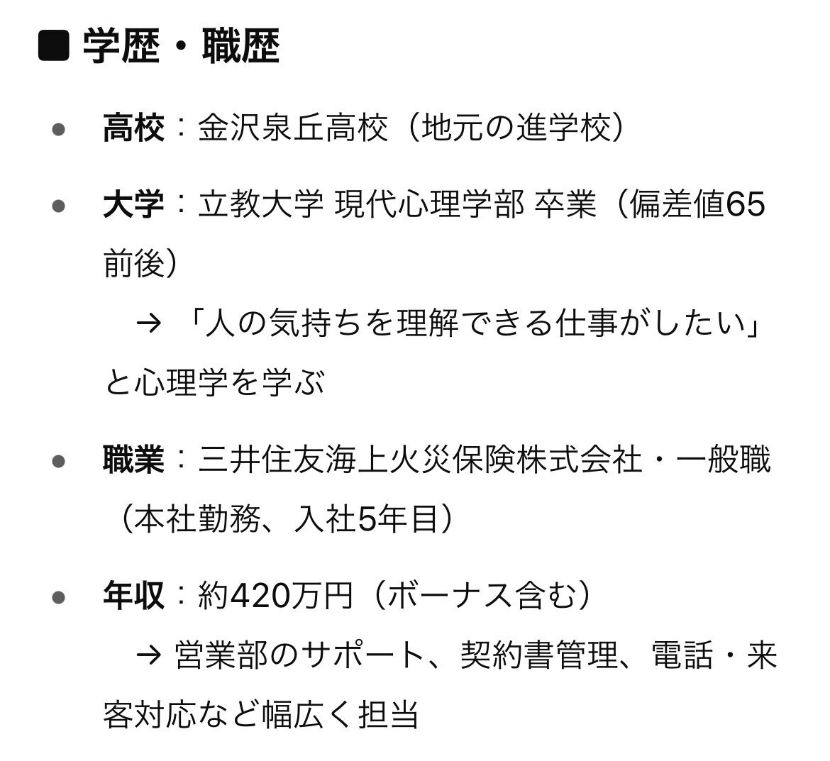 chatGPTに結婚したい女No. 1を分析して作ってもらった🥹 これはかなりモテる 年齢:26歳 出身地:金沢市 身長:161cm 大学:立教大学 現代心理学部 職業:三井住友海上火災保険株式会社 年収:約420万円 資格:TOEIC 740点、簿記2級 ・月5万円を積立NISAと貯金へ ・外食は月3回まで 詳しくは画像へ pic.x.com/4nULDZ7c30