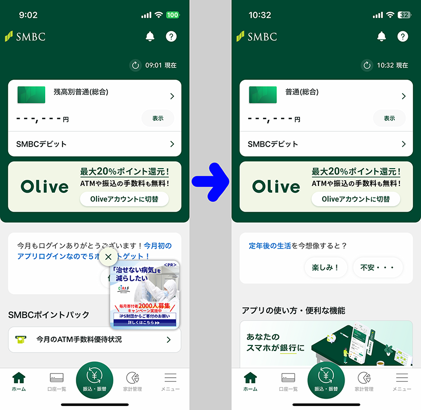 アプリに限らず色んな所でオリーブにしろって出てきて、もう資金全部別の銀行に移したろかと思うレベル(それは言い過ぎ >三井住友銀行アプリを起動すると、口座切替の案内が詐欺めいたポップアップで出てくる こういう勧誘方法を使ってくる時点で絶対切り替えない togetter.com/li/2629035