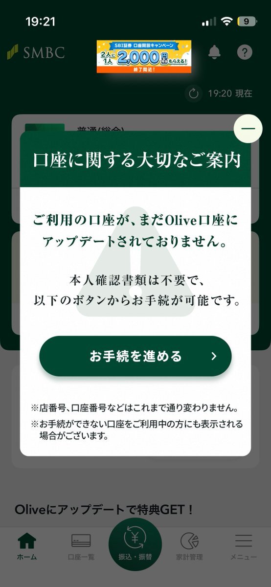 三井住友銀行アプリを起動すると、口座切替の案内が詐欺めいたポップアップで出てくる こういう勧誘方法を使ってくる時点で絶対切り替えない togetter.com/li/2629035.