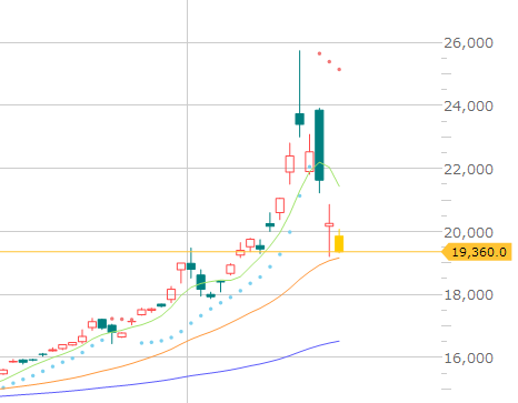 *10/23追記 私の危惧は的中したね。10/17に長い上髭をつけた陰線が出たので、こりゃヤバいな、と思ったわけよ。案の定、ずるずる下がっている。ちなみに、かといって、純金上場投資信託(1540)を空売りできたかといったら難しい。空売りしないまでも離れることは可能。一般人がに殺到したら天井。 pic.x.com/LOOLcdOQgU
