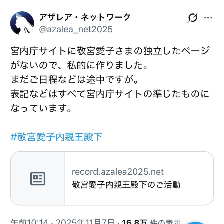 返信先:@sasaranainewsこんばんは🌝またまたご存知でしたらすみません。アザレア・ネットワーク様が単独敬宮さまのご活動サイトを作って下さいました。アジアのけいちゃんも先程取り上げてくださいましたが(Xされてない方のために)刺さらない様にも是非取り扱って頂きたいです🙏素晴らしいサイトです pic.x.com/tYE3Ef0ESh