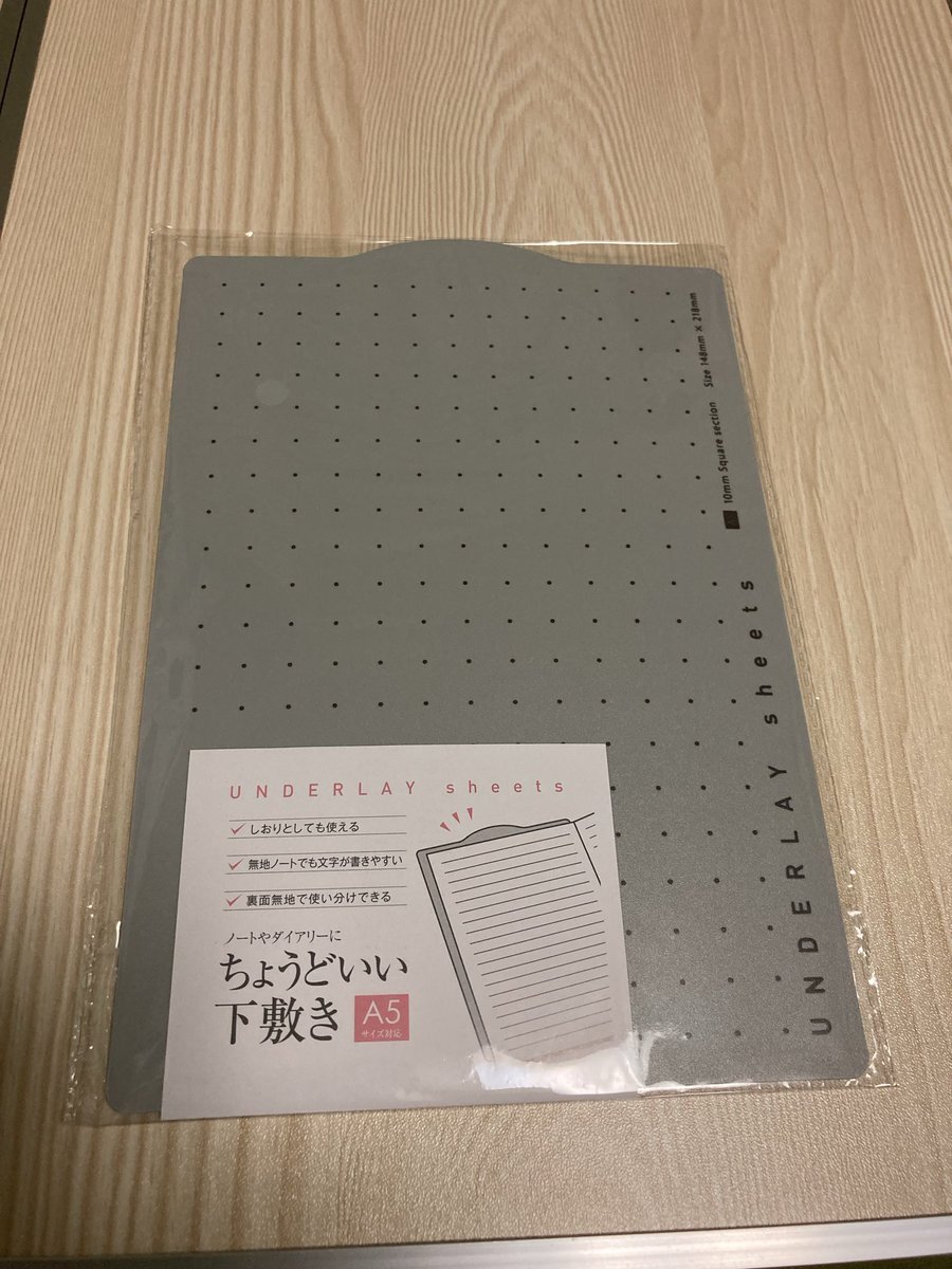 で、よいとこがサイズ展開だと思う この画像ではA5ってかいてあるけど 私はB5もってるし確かA4もあったはず 自分のサイズに合わせてかっこいい下敷き使えるの良いよね! ただ本当凸凹の上に置くと柔らかいからか曲がりやすくてそこだけが⭐️3かな!