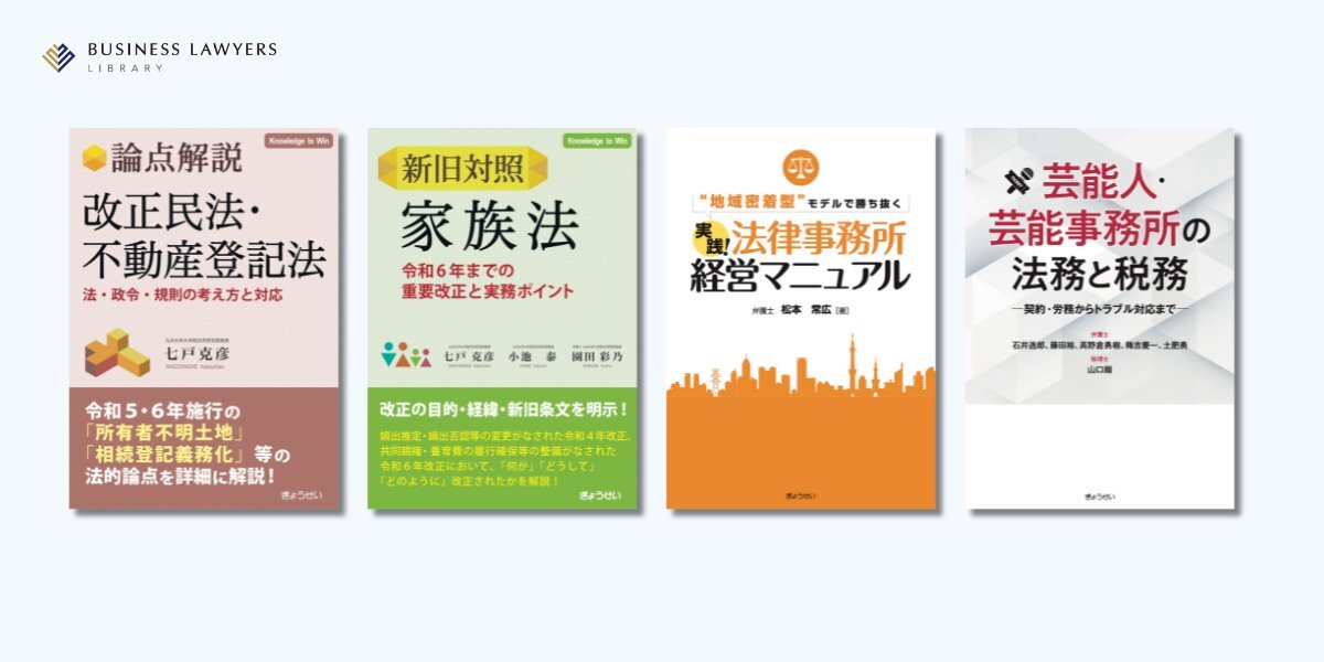 【新掲載書籍のご紹介】 ◆論点解説 改正民法・不動産登記法 ◆新旧対照 家族法 ◆実践! 法律事務所経営マニュアル ◆芸能人・芸能事務所の法務と税務 (ぎょうせい) #BUSINESS_LAWYERS_LIBRARY #ビジネスロイヤーズライブラリー pic.x.com/QGMJpldZTq